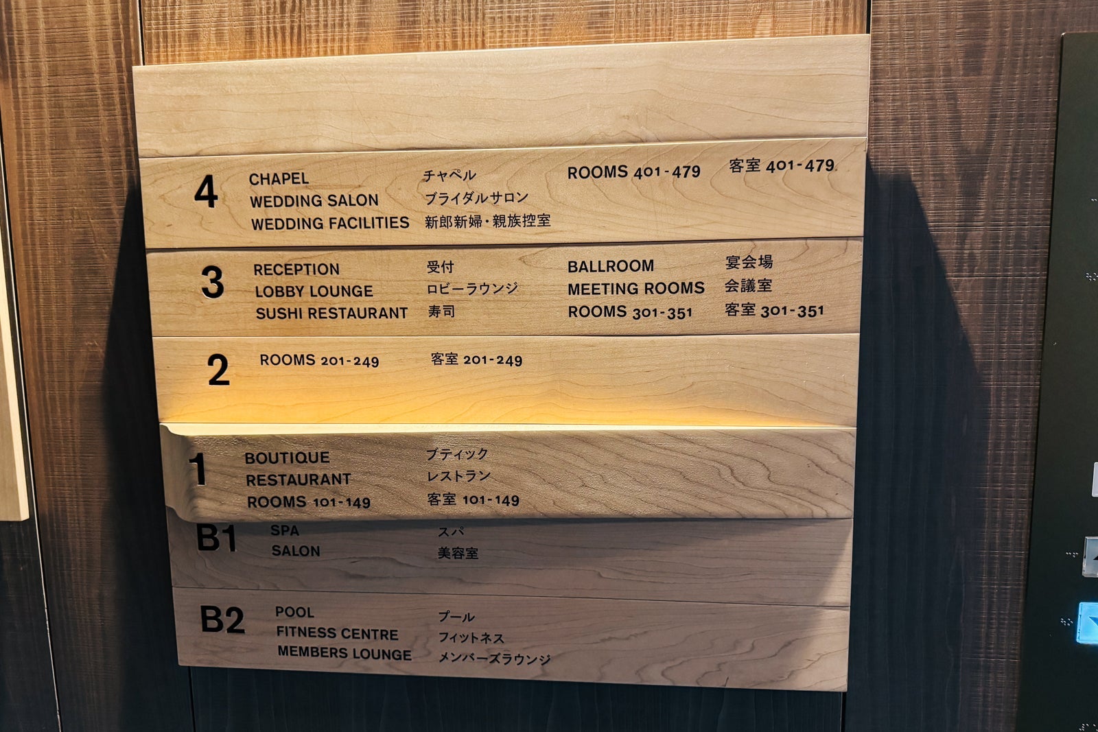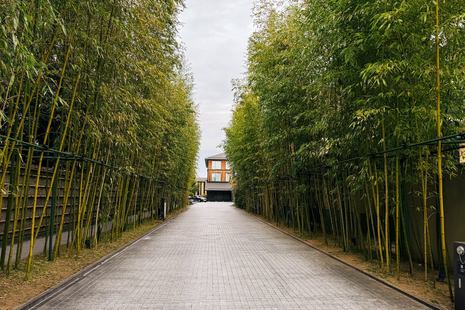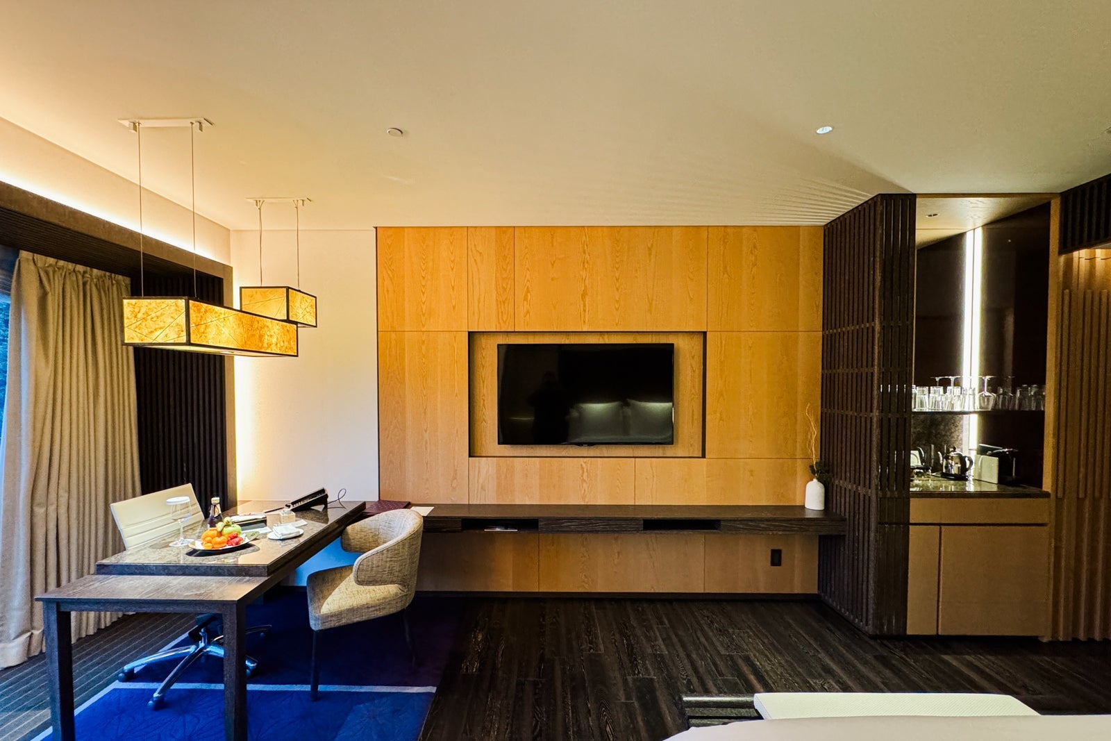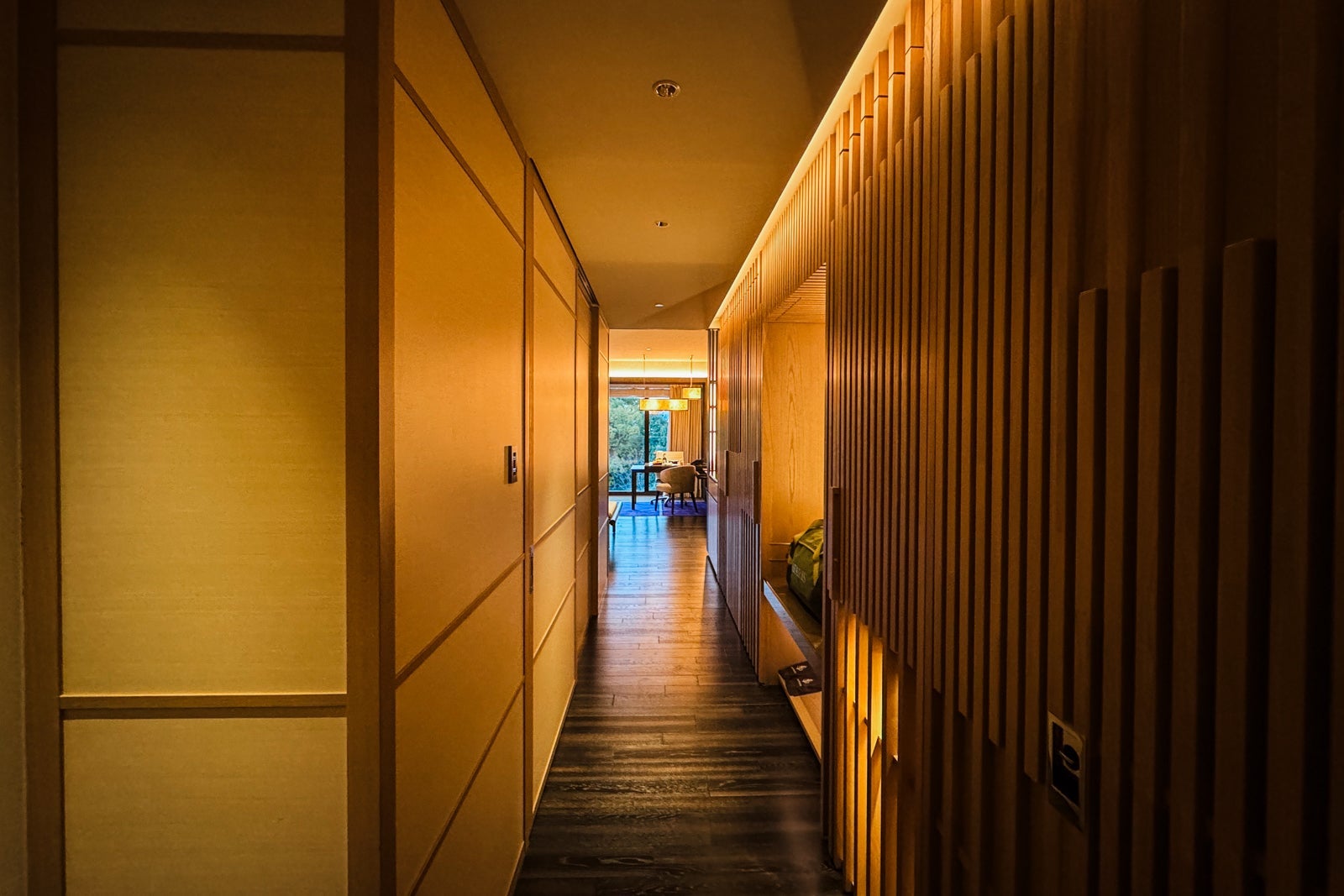 Along one wall, the wooden paneling was reminiscent of Kyoto's famous Arashiyama bamboo grove; it held the closet with a safe and hanging area, as well as a spacious surface for storing luggage.