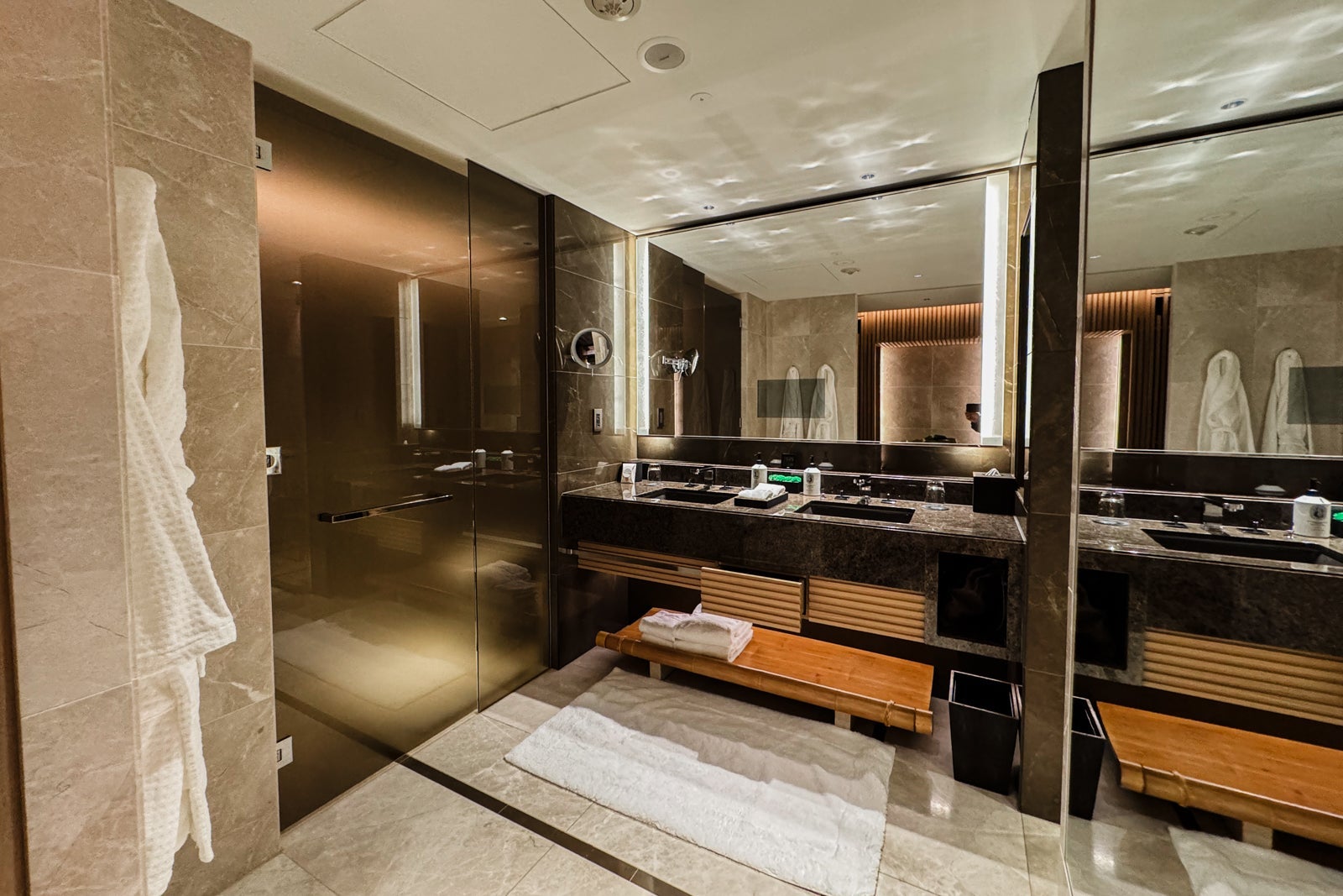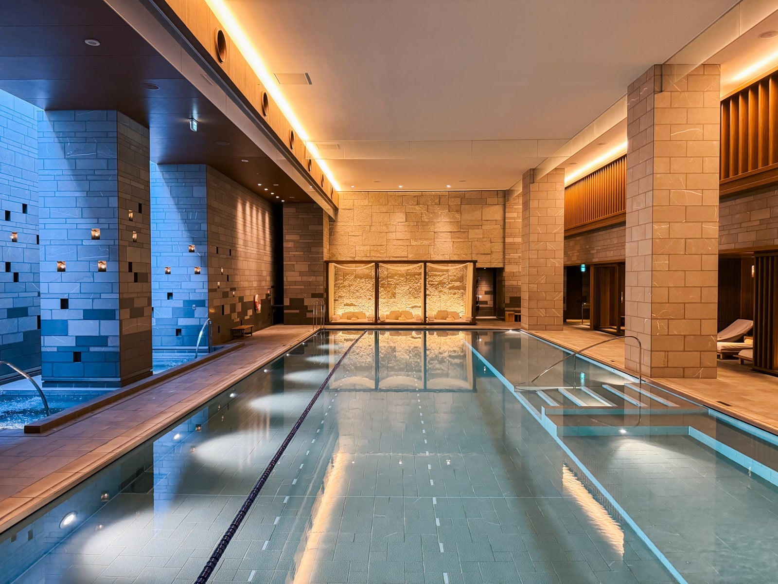 Its wellness complex, meanwhile, occupies two floors (B1 and B2). On one level, the expansive gym is equipped with Matrix cardio equipment, various weight machines and free weights, and a stretching and yoga studio. There are men's and women's locker rooms with bathrooms, showers, white-granite ofuros alongside traditional washing stations, steam rooms, saunas and resting areas.