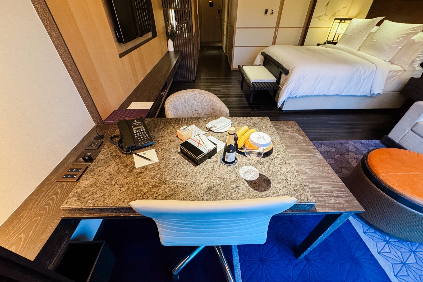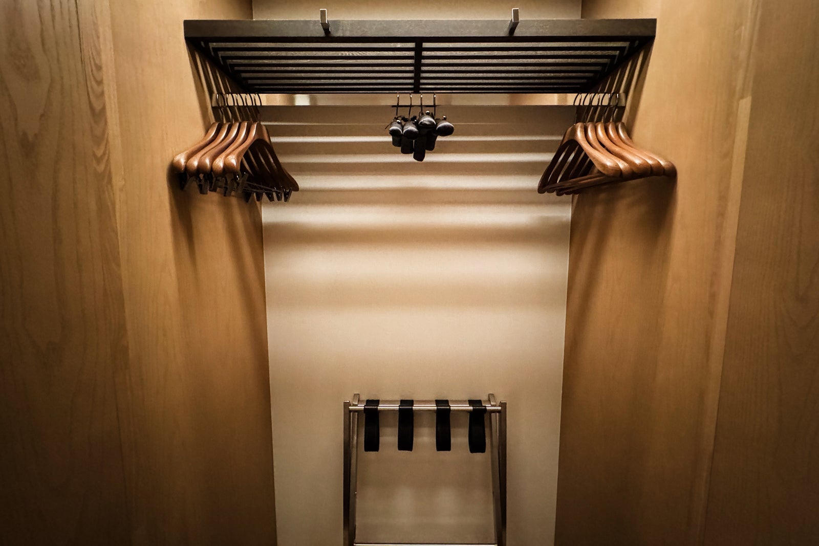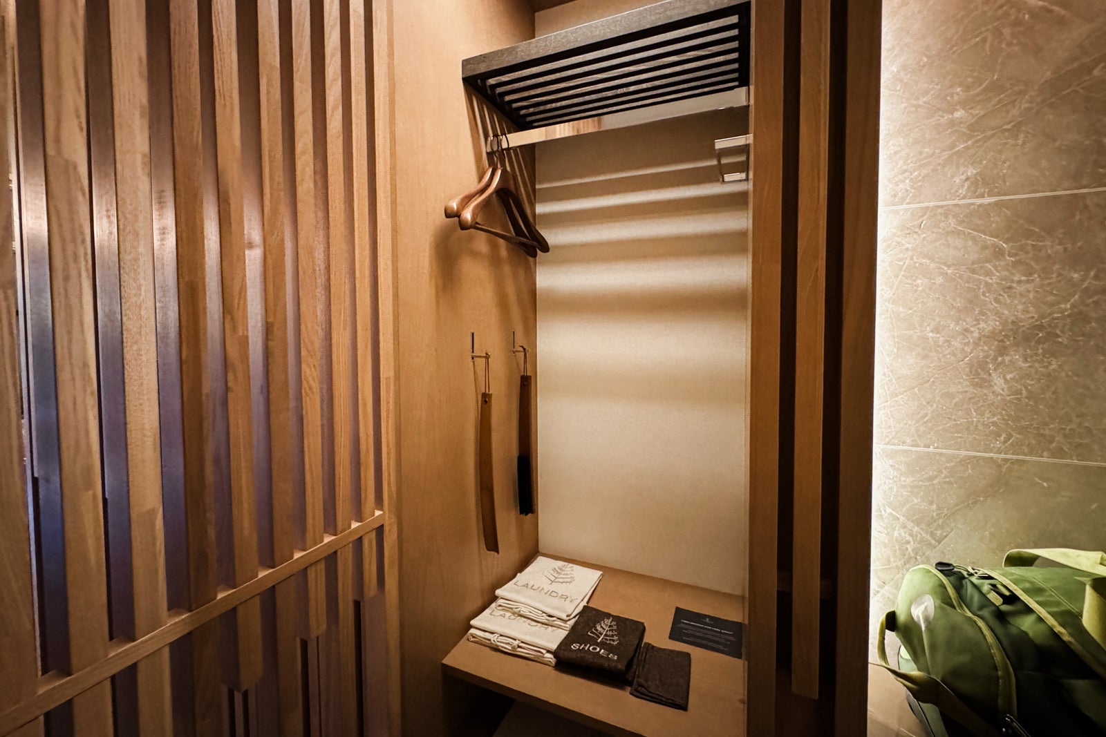 Along one wall, the wooden paneling was reminiscent of Kyoto's famous Arashiyama bamboo grove; it held the closet with a safe and hanging area, as well as a spacious surface for storing luggage.