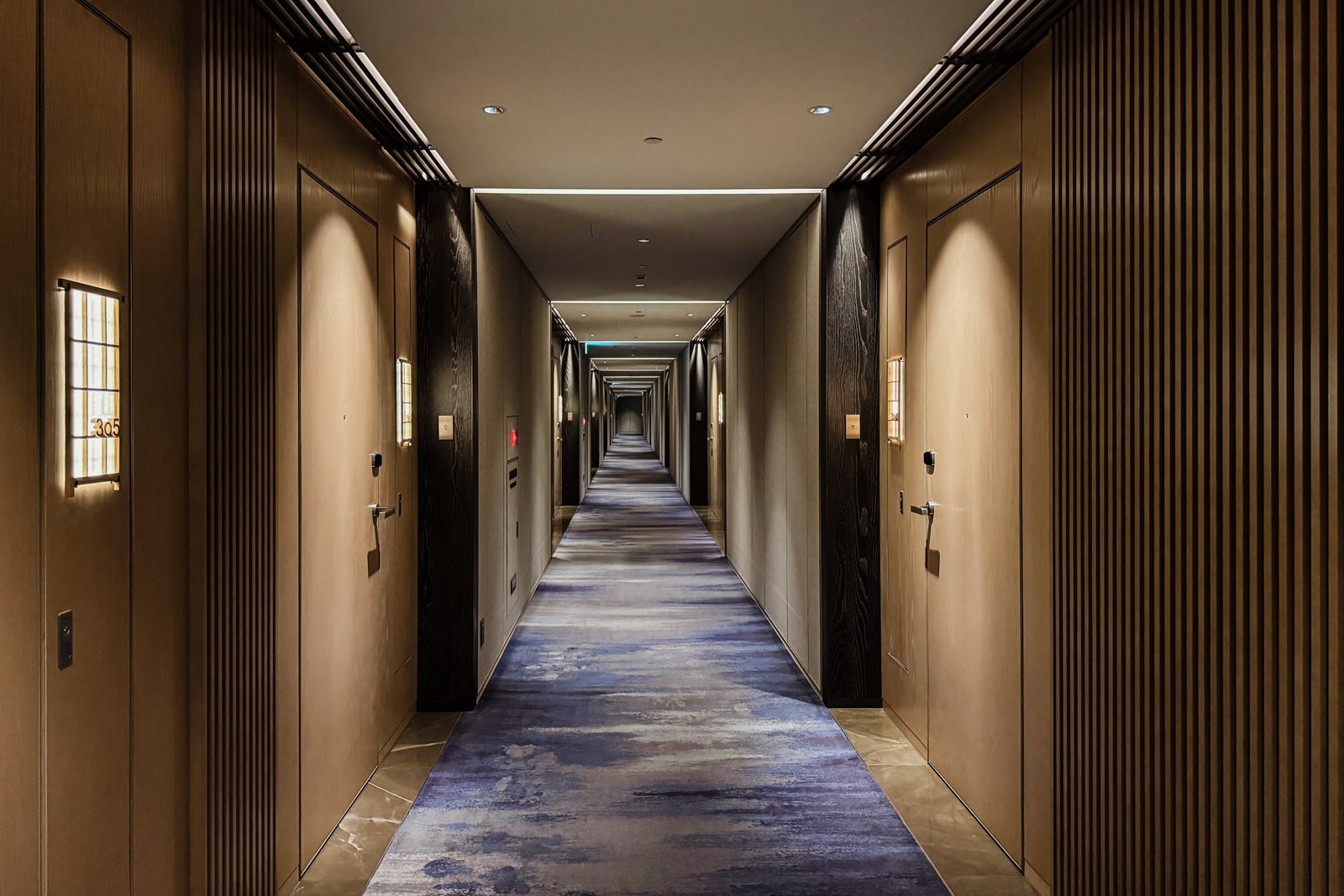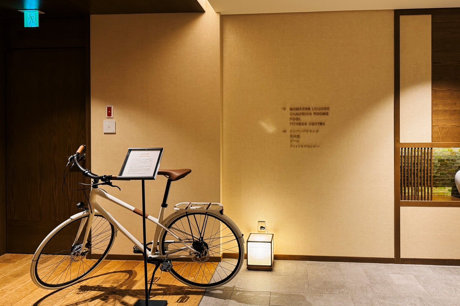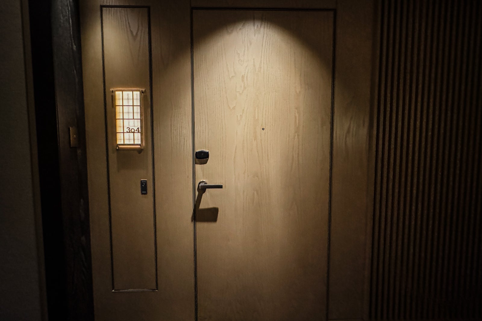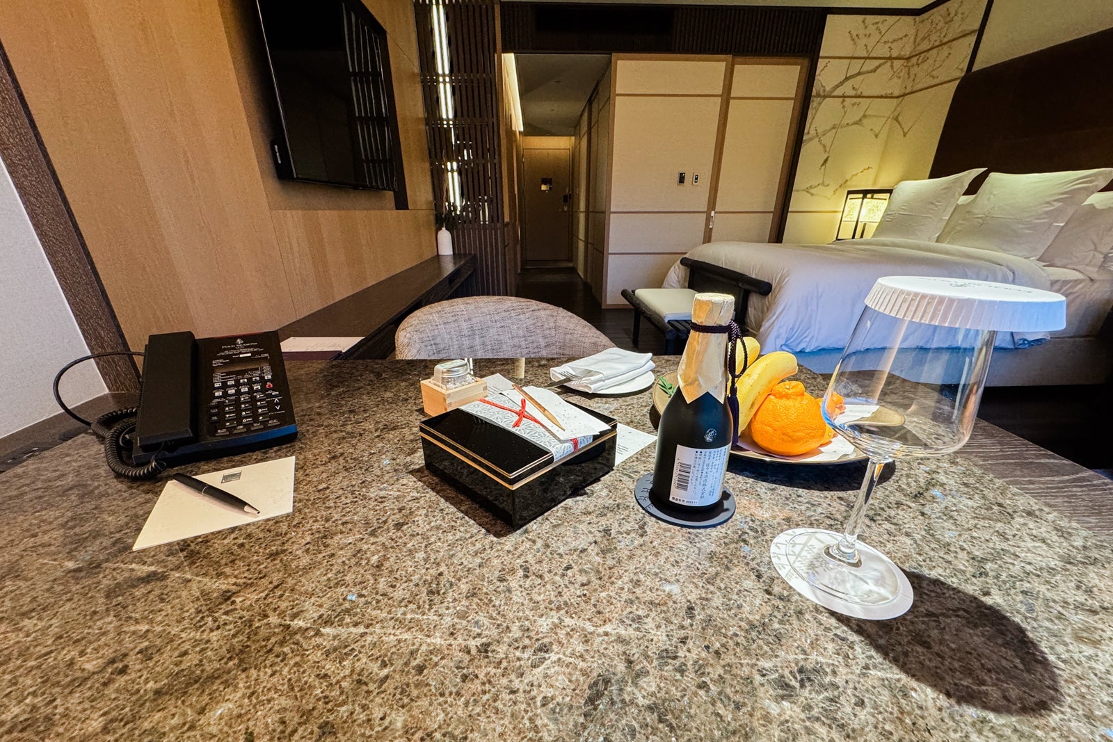 Along one wall, the wooden paneling was reminiscent of Kyoto's famous Arashiyama bamboo grove; it held the closet with a safe and hanging area, as well as a spacious surface for storing luggage.