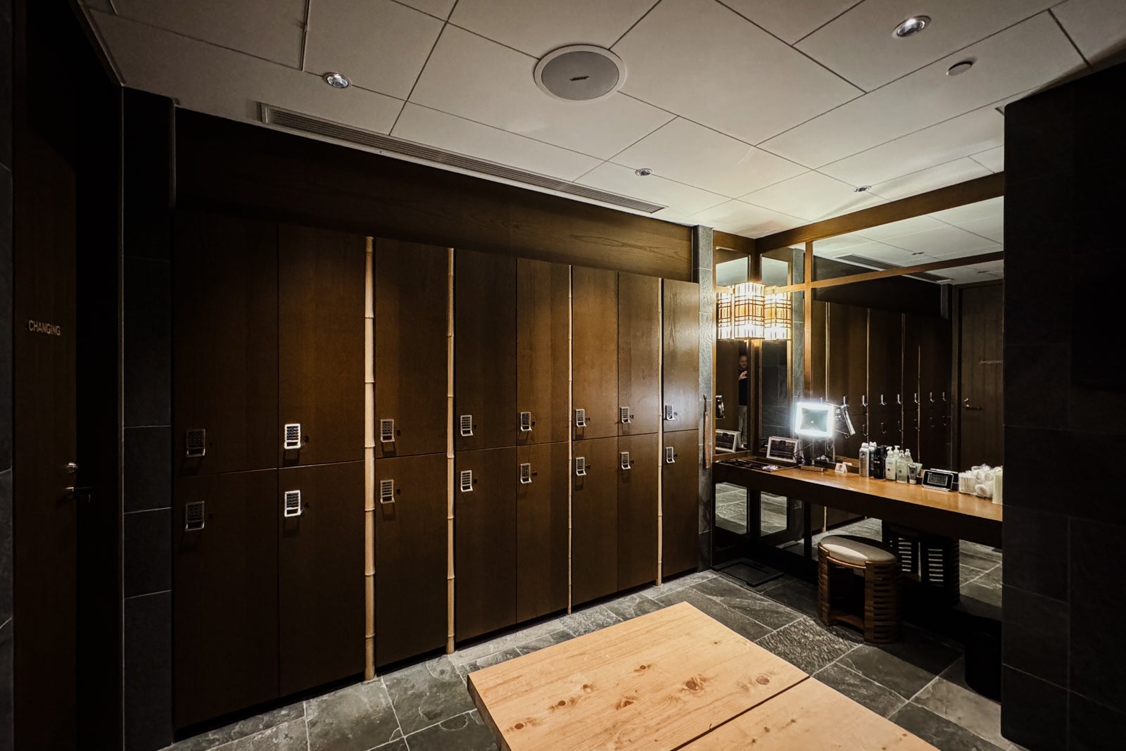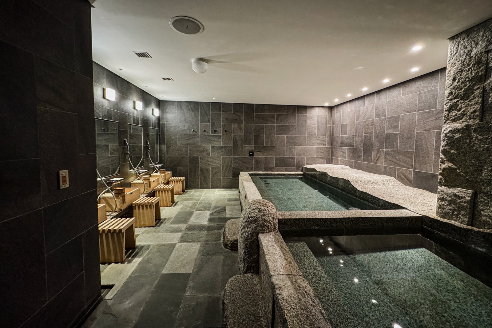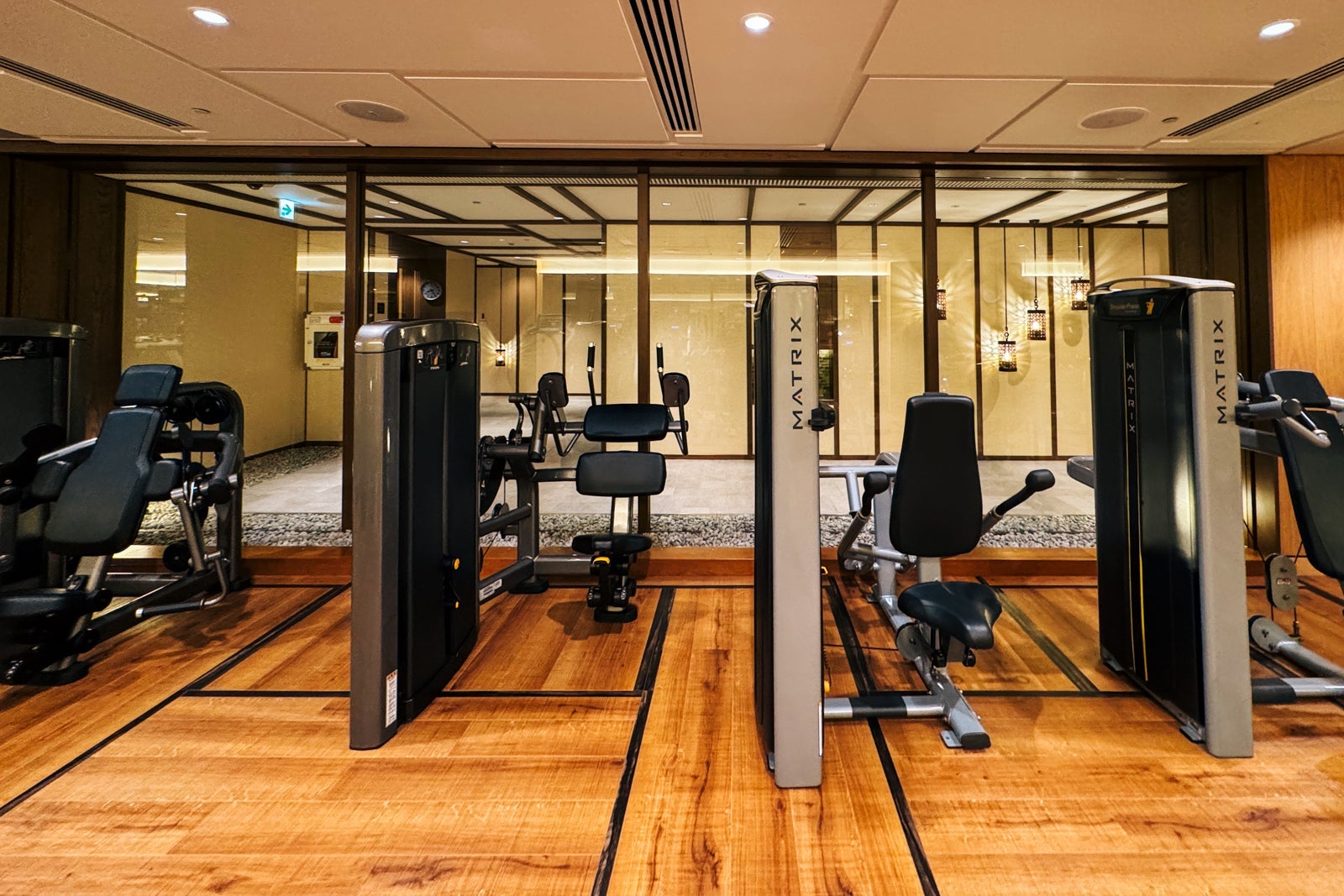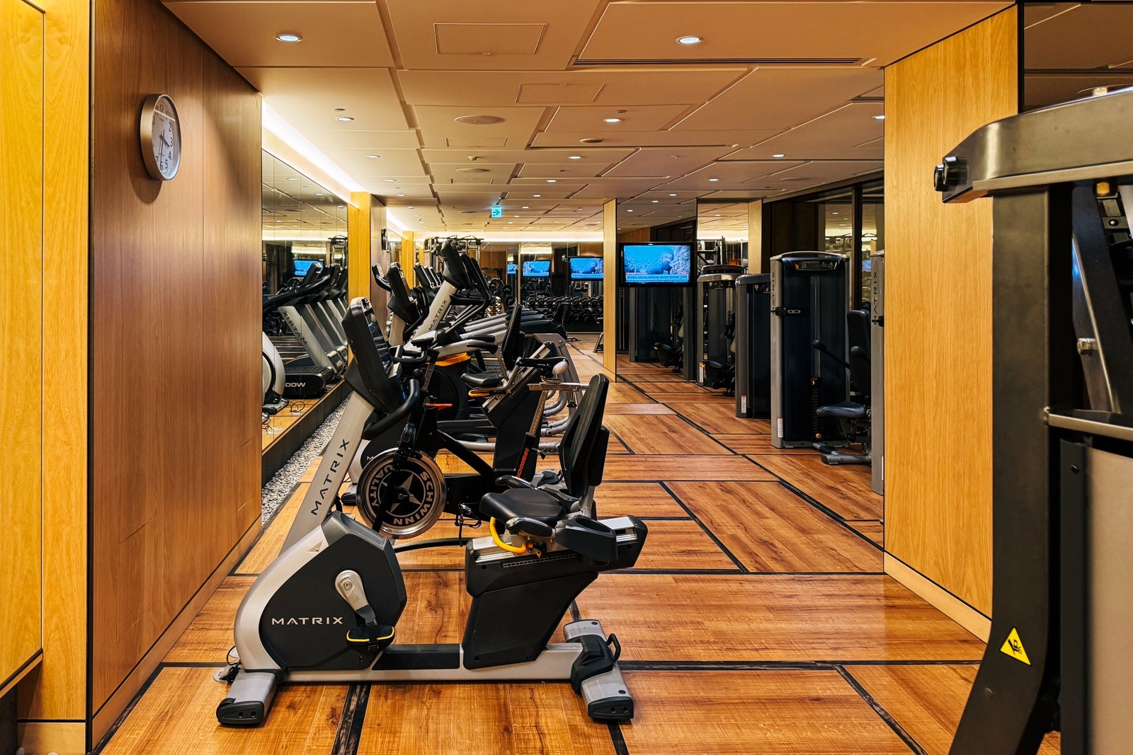 Its wellness complex, meanwhile, occupies two floors (B1 and B2). On one level, the expansive gym is equipped with Matrix cardio equipment, various weight machines and free weights, and a stretching and yoga studio. There are men's and women's locker rooms with bathrooms, showers, white-granite ofuros alongside traditional washing stations, steam rooms, saunas and resting areas.