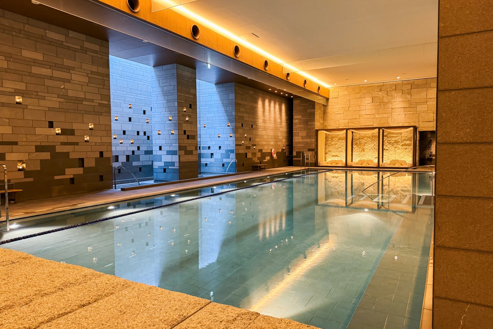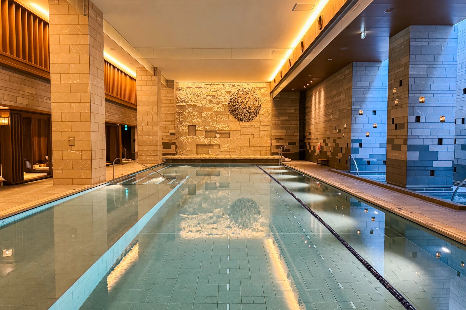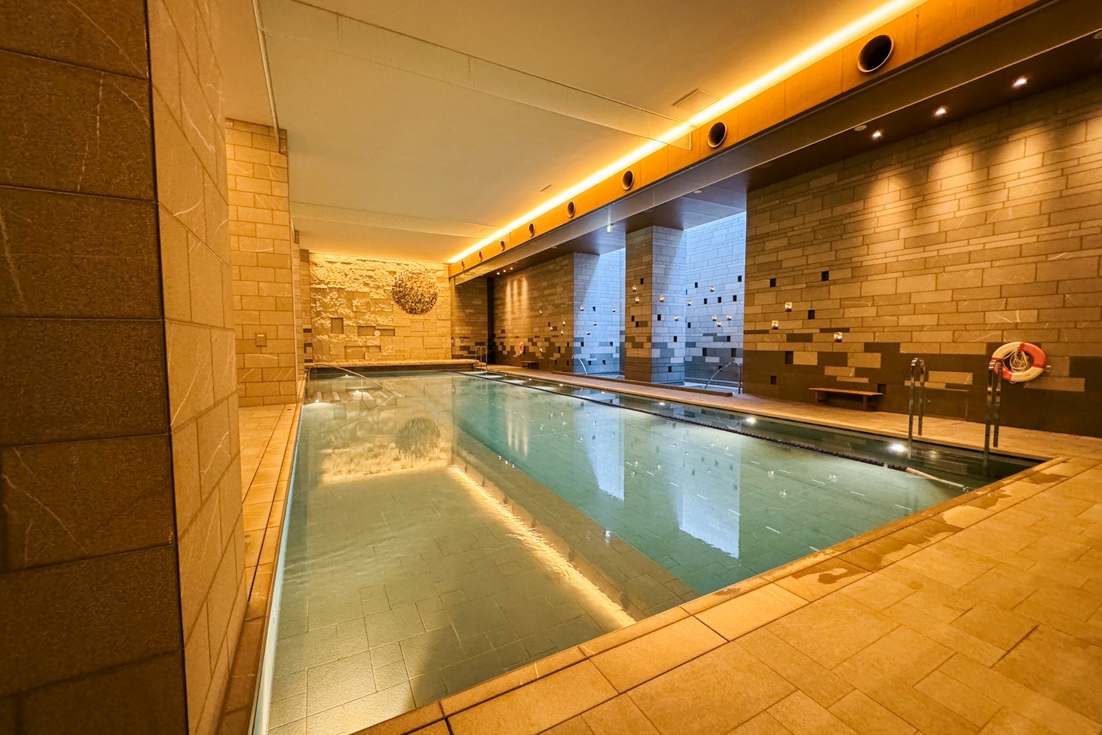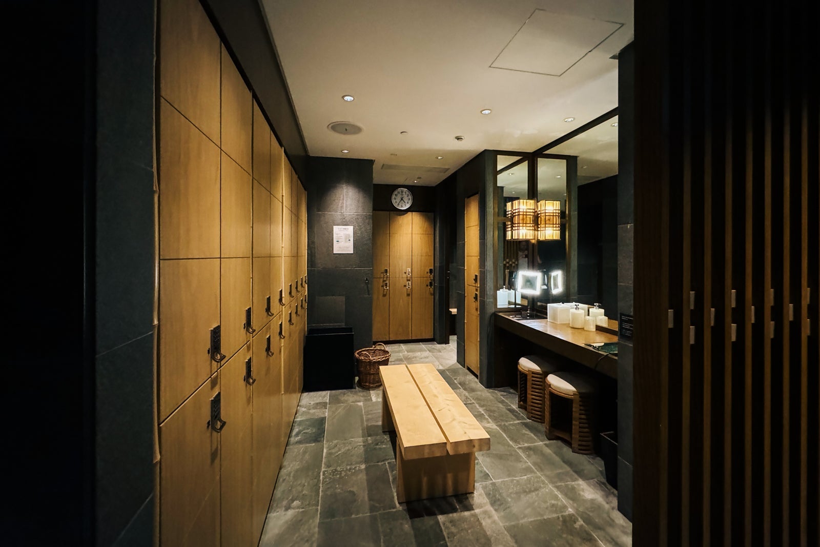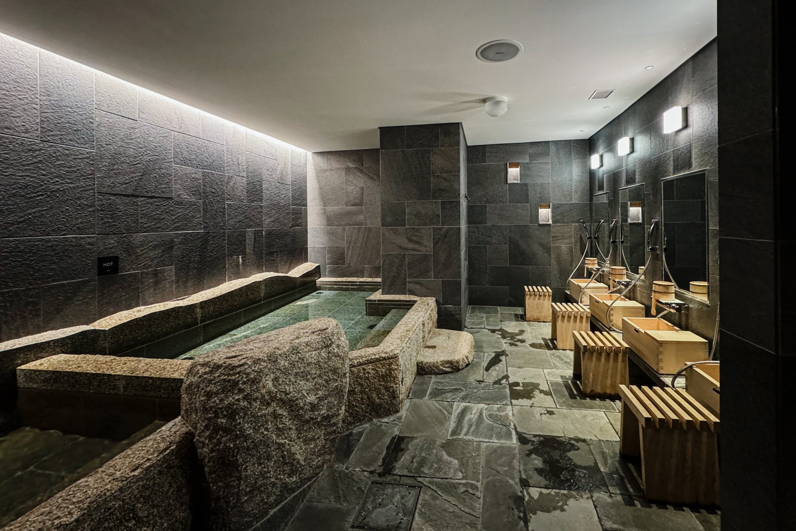 Its wellness complex, meanwhile, occupies two floors (B1 and B2). On one level, the expansive gym is equipped with Matrix cardio equipment, various weight machines and free weights, and a stretching and yoga studio. There are men's and women's locker rooms with bathrooms, showers, white-granite ofuros alongside traditional washing stations, steam rooms, saunas and resting areas.