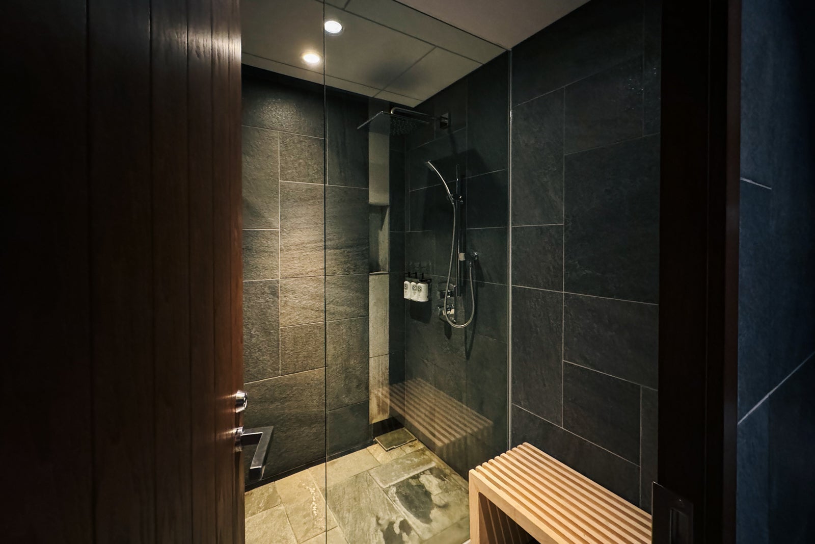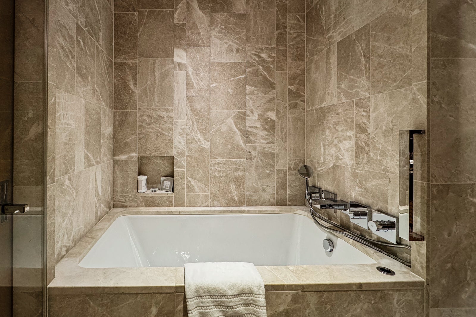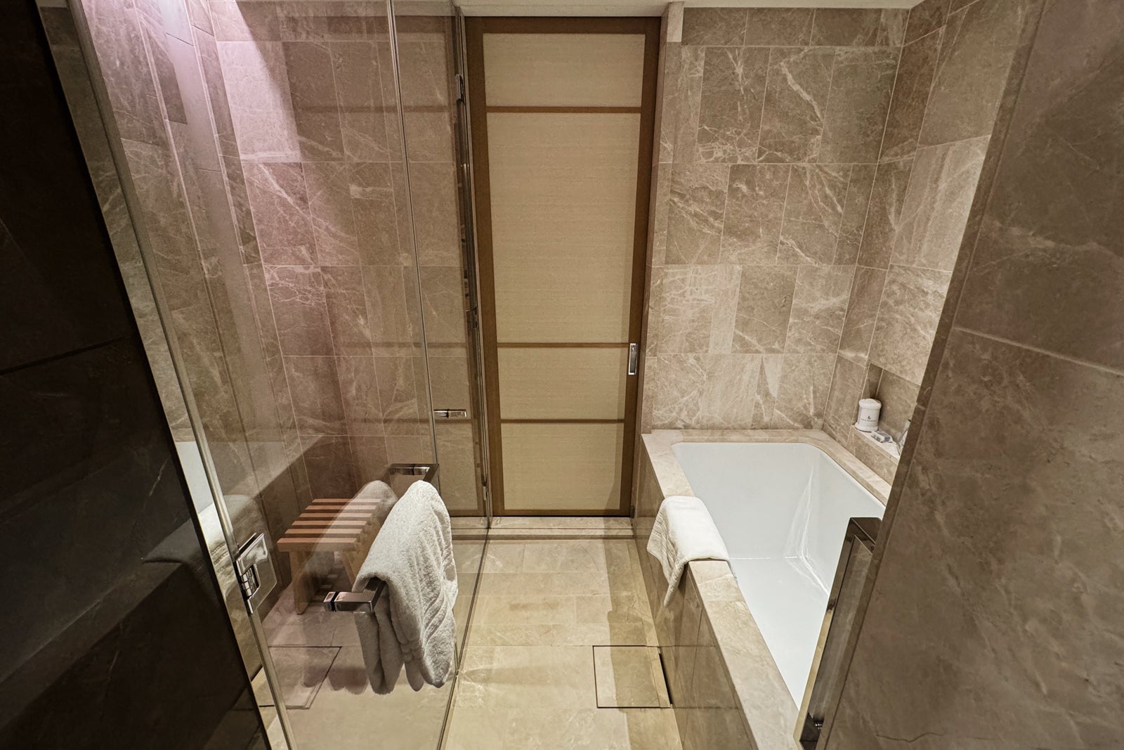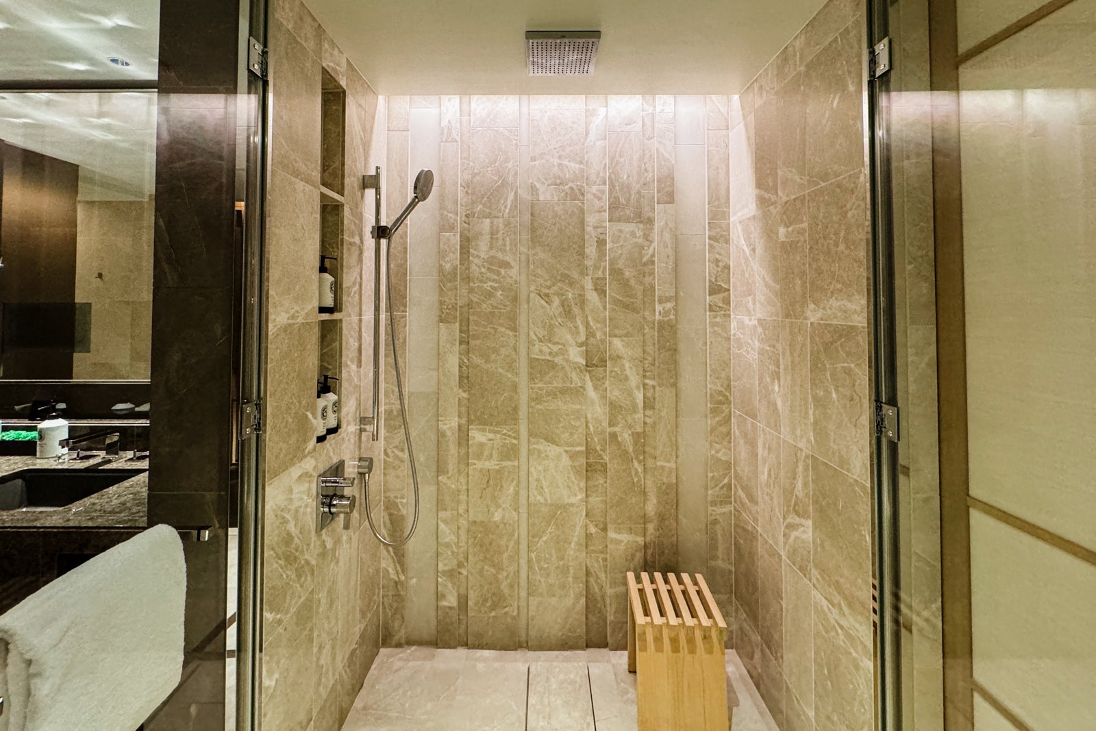 Through a swinging glass door, the bathing area held the shower and the bathtub. The open shower had both an overhead and wall-mounted showerhead that you could also detach to hold in your hand, and the space was stocked with full-size Diptyque products.