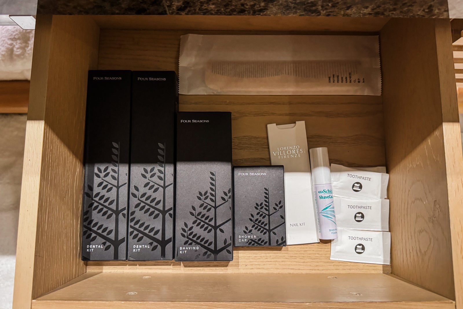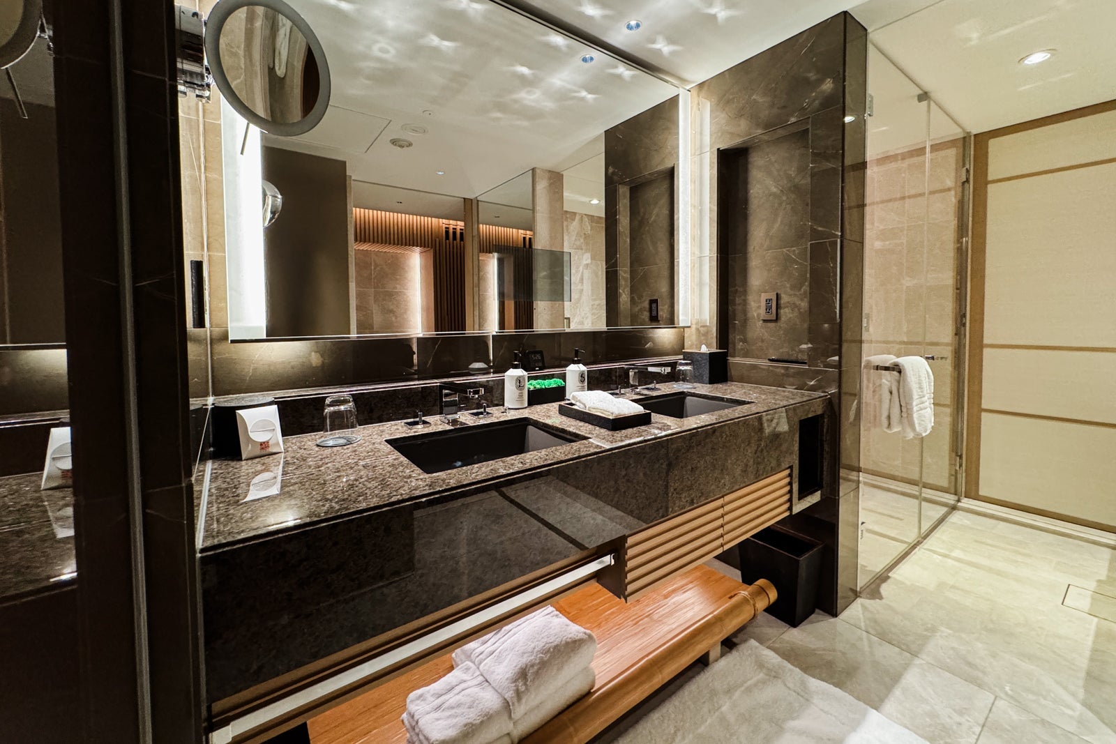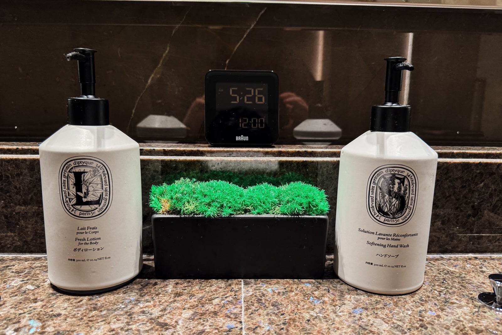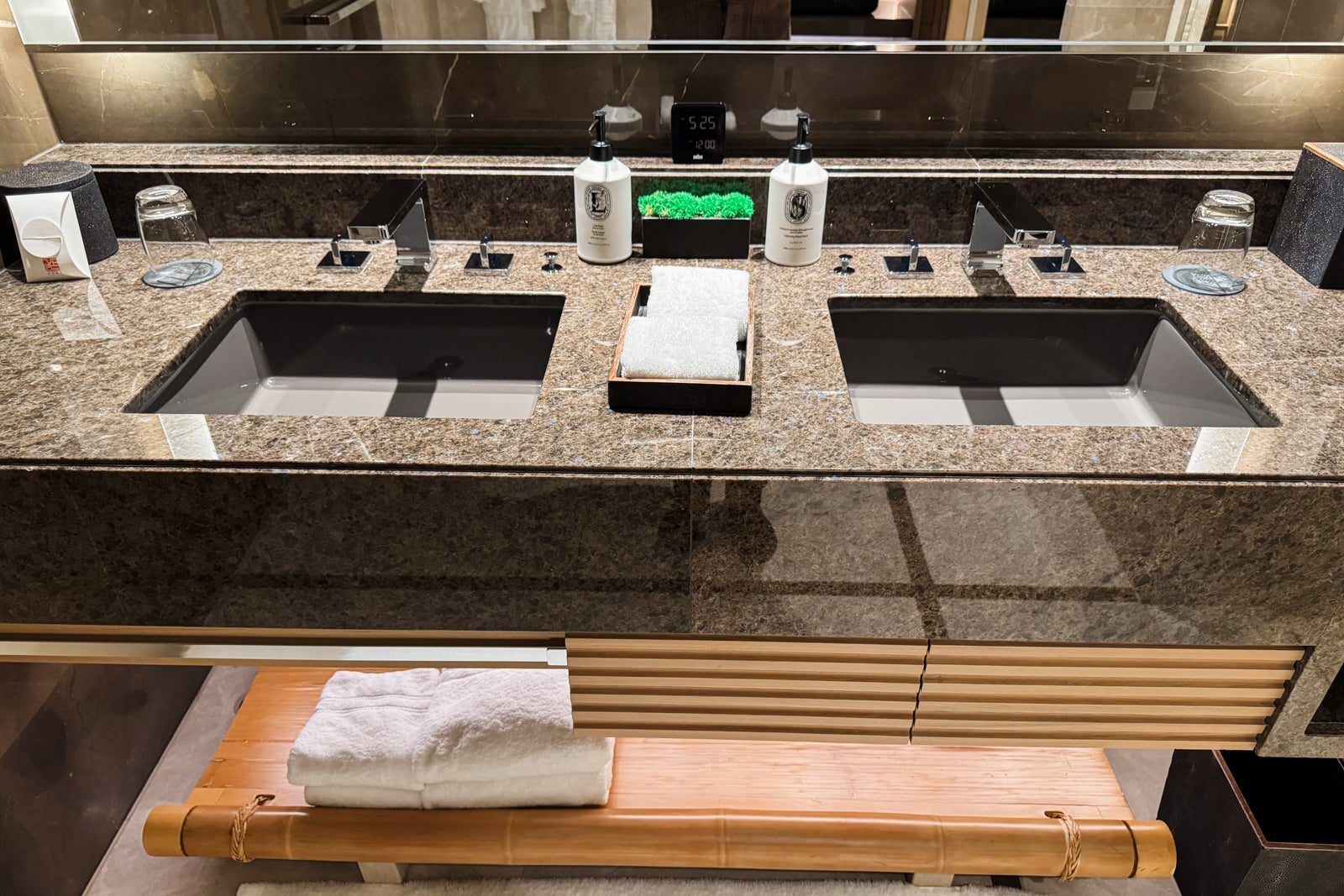 The main area had a sandy-colored marble floor and wall tiling with dual black granite sinks at the vanity. A drawer was stocked with amenities in case you left any toiletries at home, along with lavender-scented Diptyque soap and lotion.