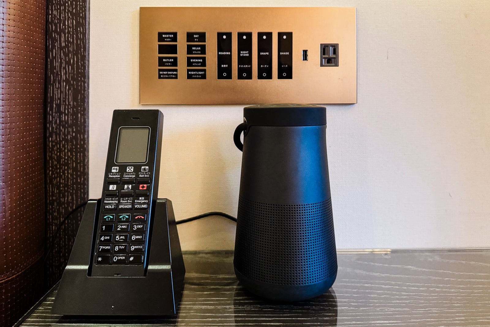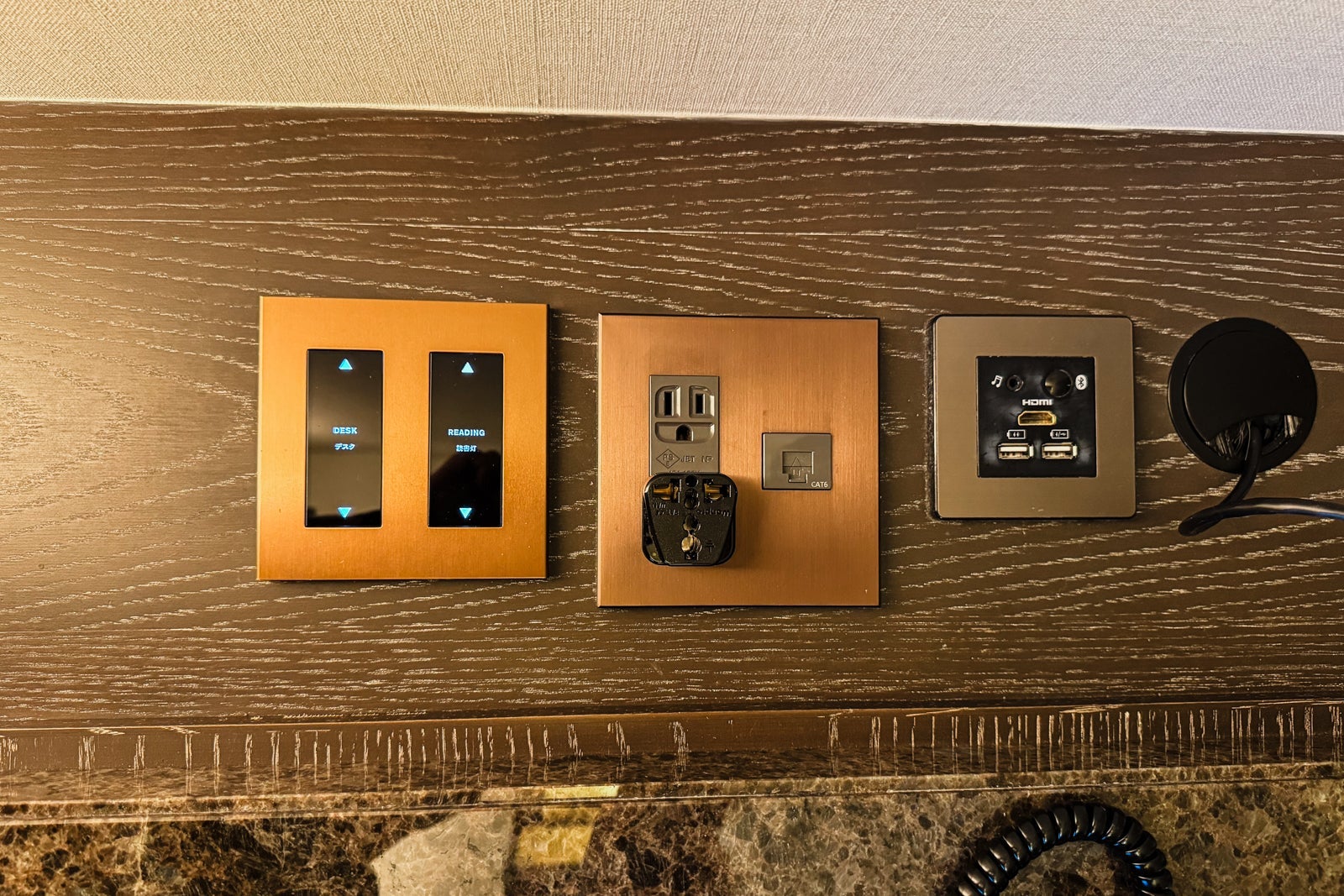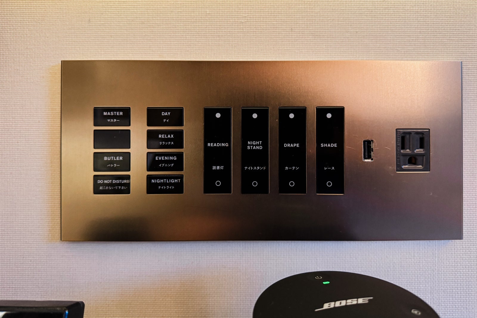 There was a nightstand to each side. One had a decorative lamp, plugs, USB ports and a tablet with hotel information; the other had a Bluetooth speaker and switches to control the room's lights, shades and curtains, which automatically lowered and closed to create a cocoon-like space.