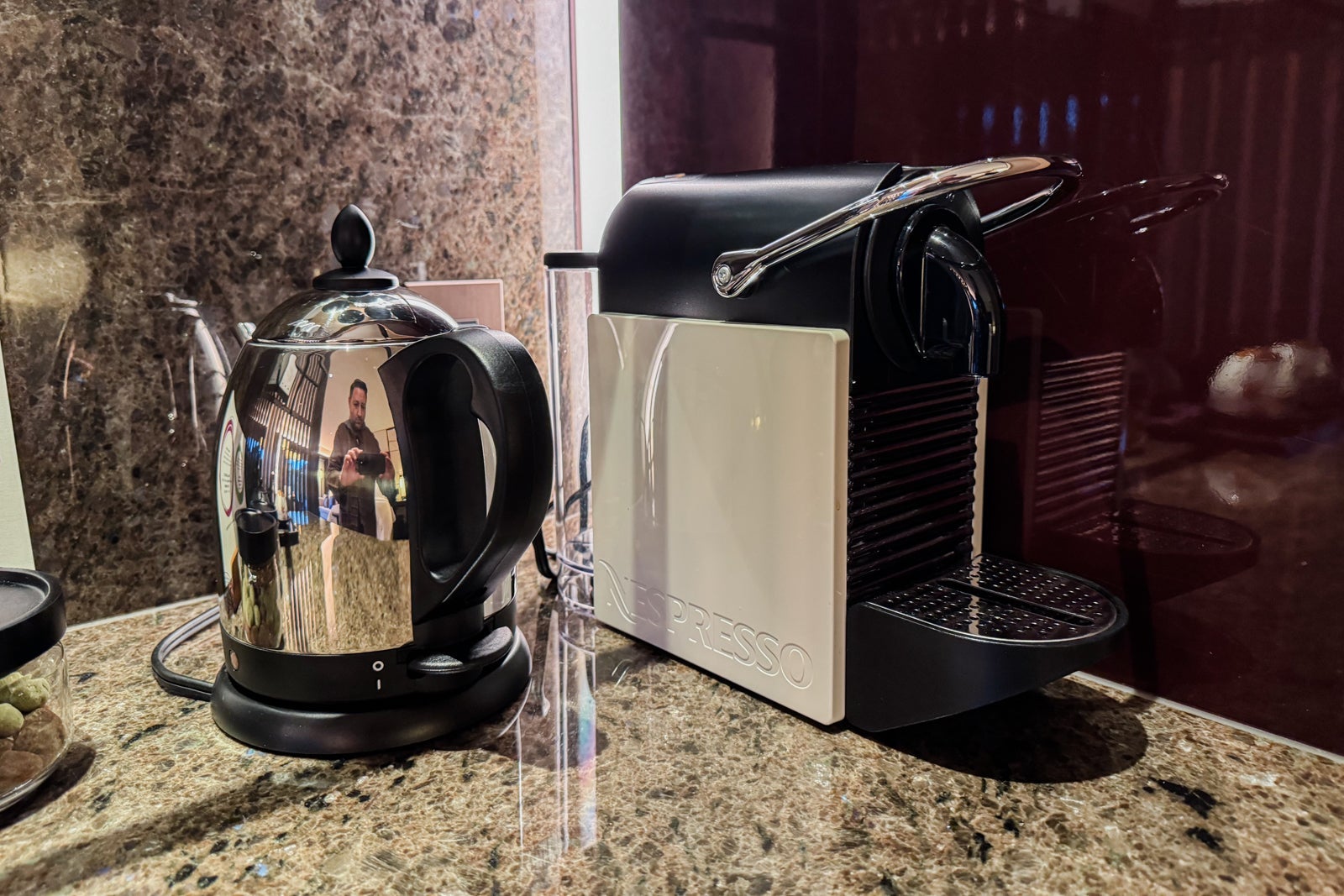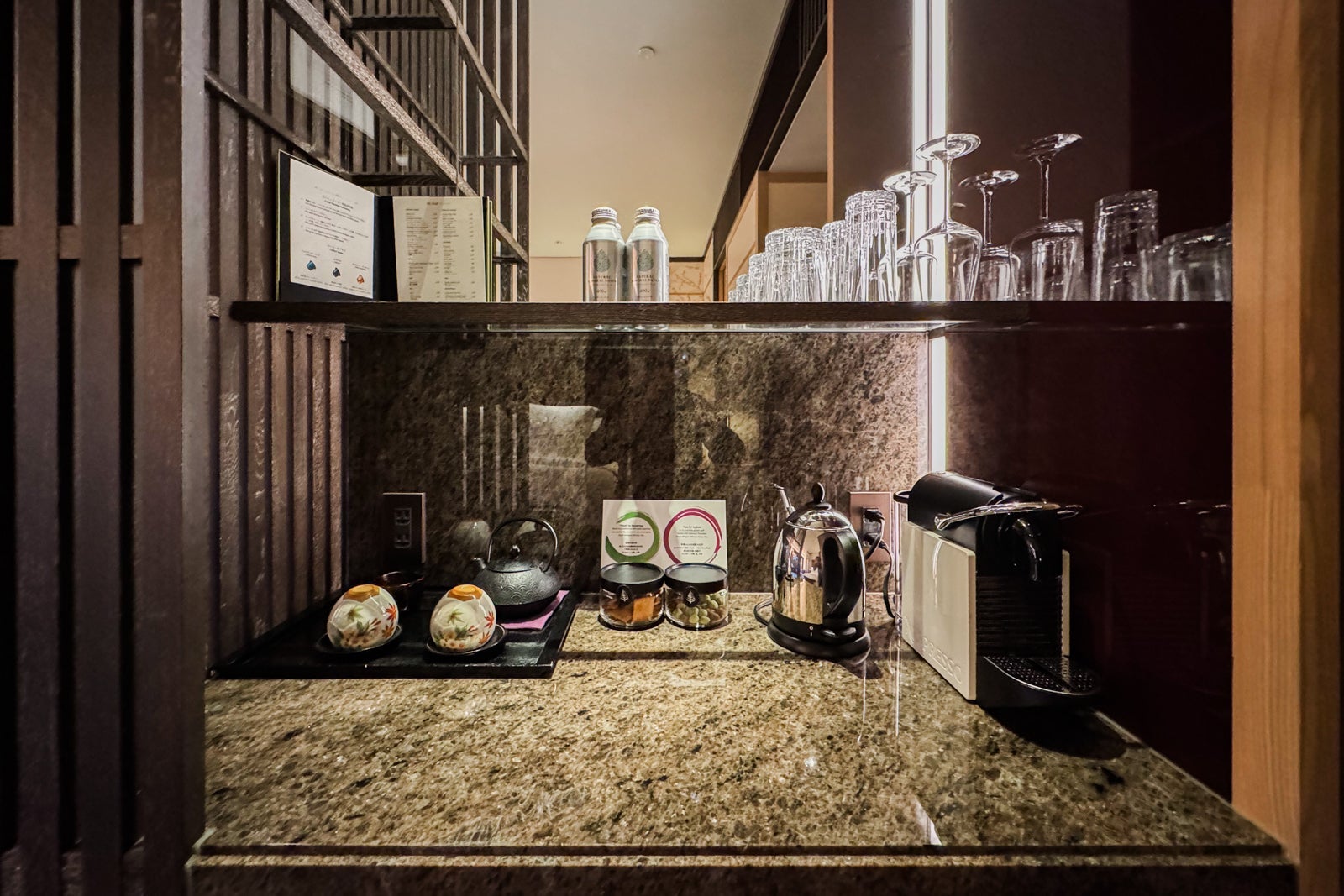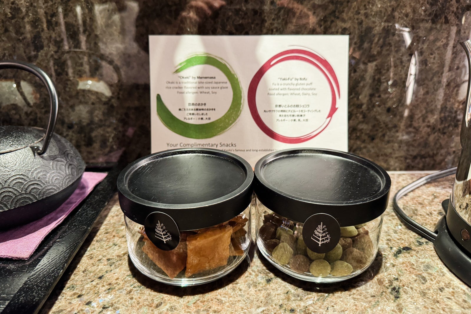 Next to this, the minibar area had a hot water kettle plus a traditional teapot with two hand-painted porcelain cups, a Nespresso machine and a variety of snacks, including complimentary soy-glazed rice crackers and chocolate-covered gluten puffs.