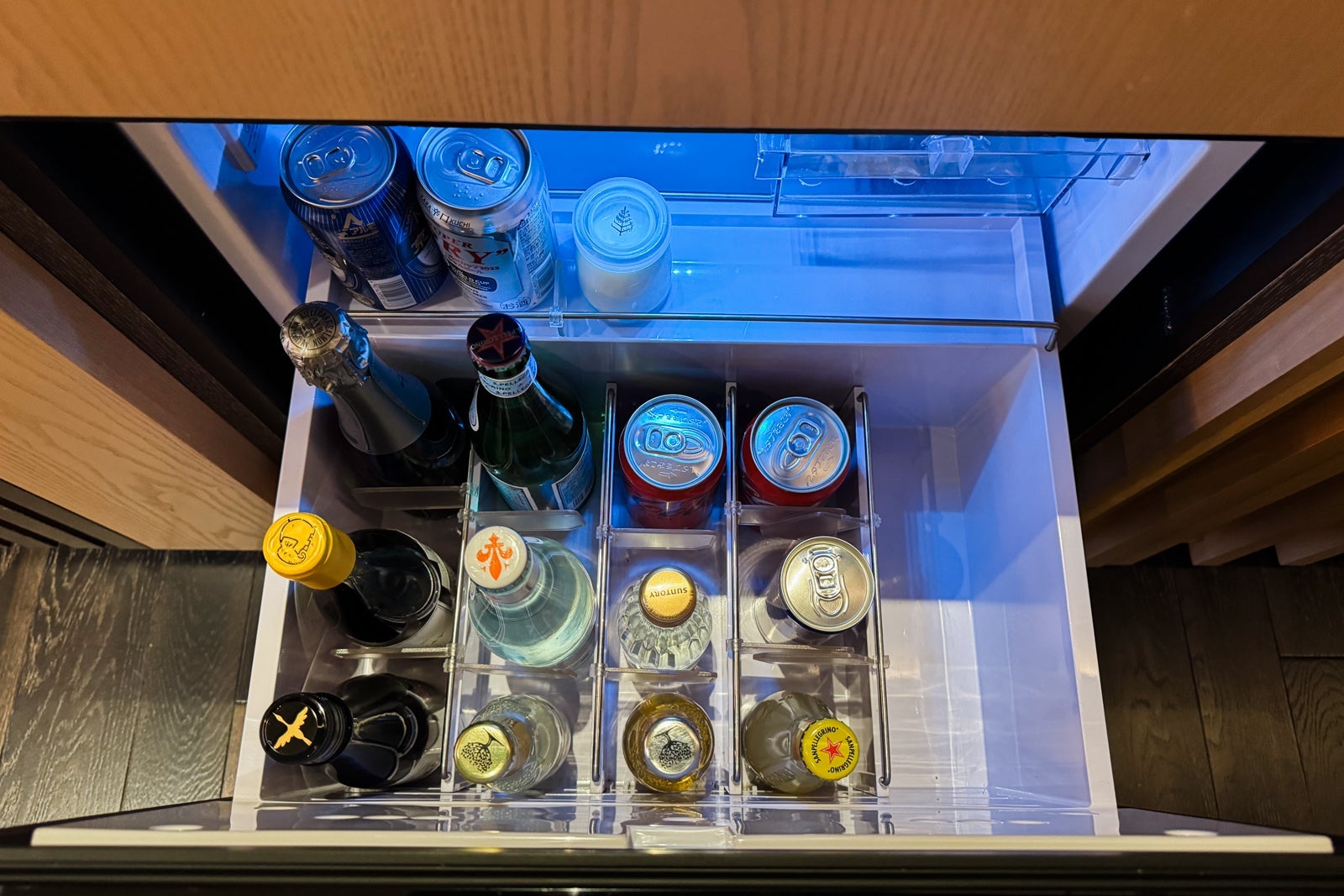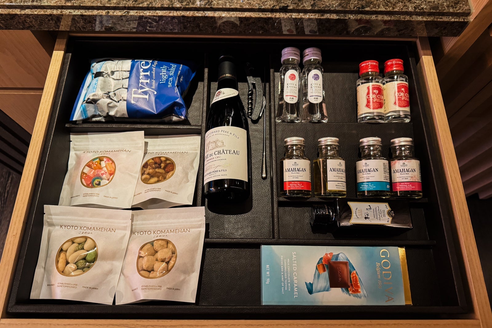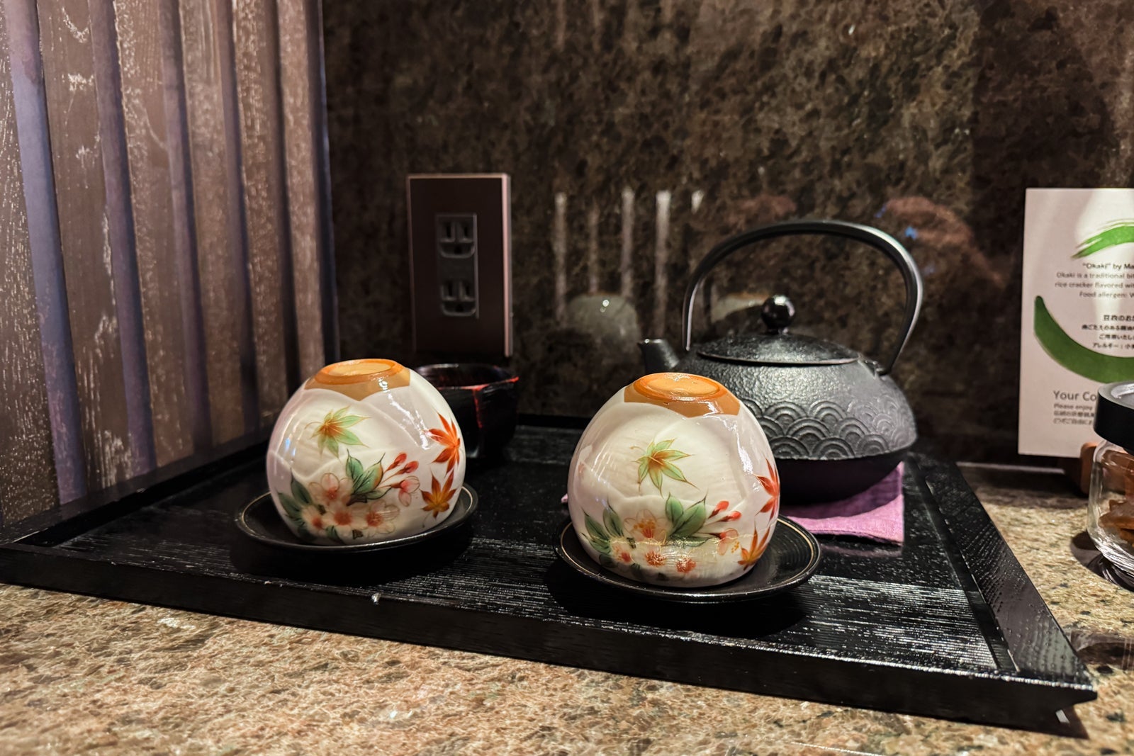 Next to this, the minibar area had a hot water kettle plus a traditional teapot with two hand-painted porcelain cups, a Nespresso machine and a variety of snacks, including complimentary soy-glazed rice crackers and chocolate-covered gluten puffs.
