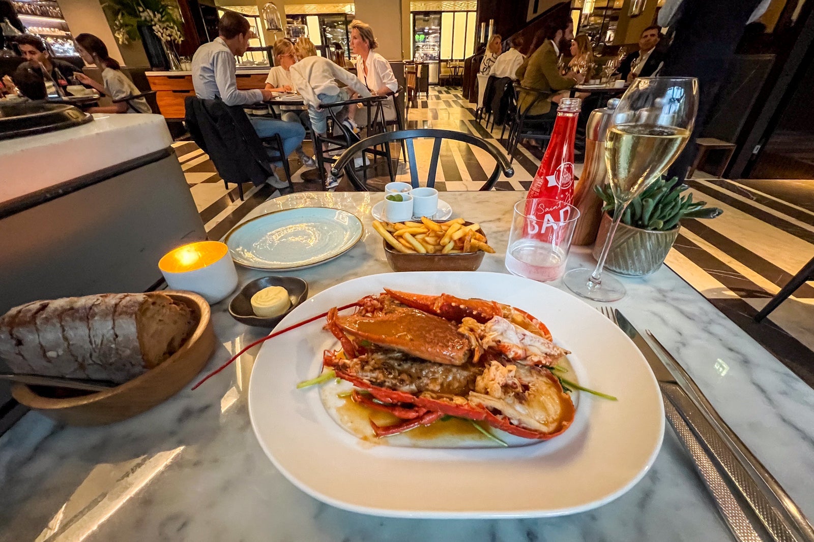 Among the dinner specialties were traditional French onion soup (21 euros, $23), Burgundy snails in parsley butter (19 euros, $21), sole meuniere with capers and fresh herbs (58 euros, $64) and classic blue lobster roasted whole with its juices and a side of crispy fries (64 euros, $70), which paired perfectly with a glass of the hotel's bespoke Champagne, Cuvée Lutetia from Taittinger (26 euros, $29).
