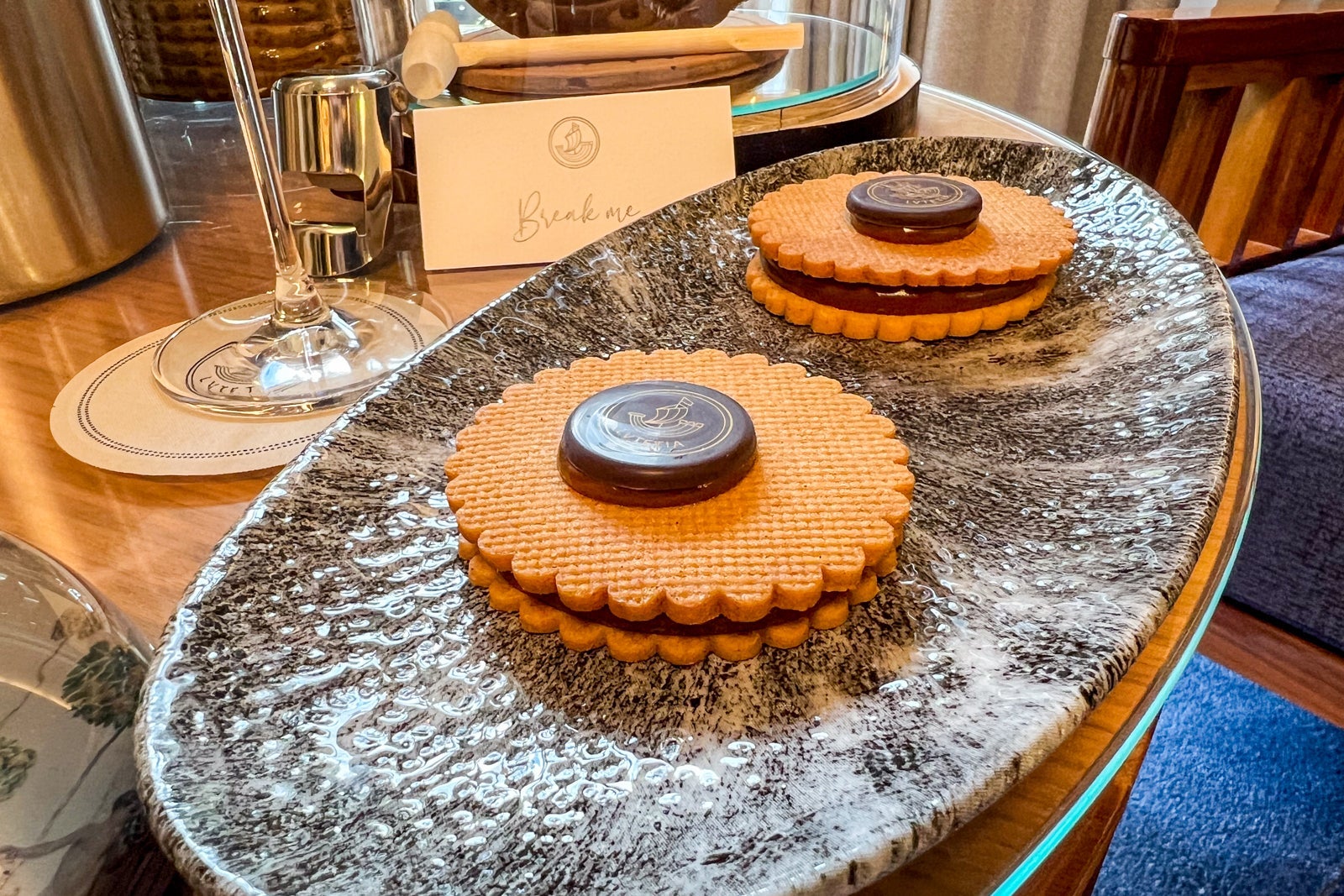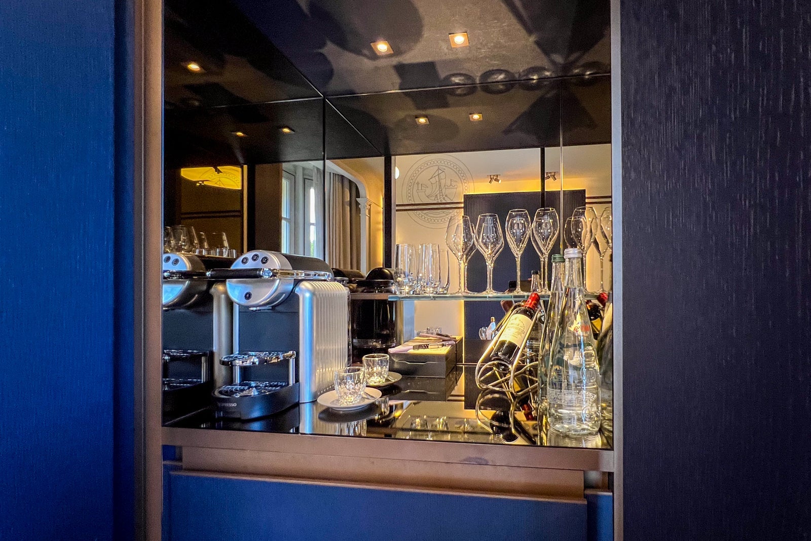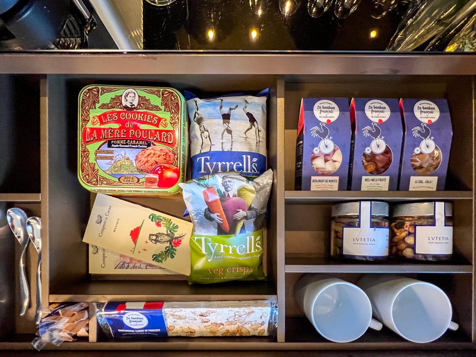 Along the wall next to the swiveling flat-screen Smart TV, the mirrored minibar held a full complement of glassware, including Champagne flutes and wine glasses with which to enjoy the red Bordeaux or white Chablis stocked as well as mugs for coffee from the in-room Nespresso machine. Among the other beverages on offer were various whiskeys and cognacs, Abatilles and Badoit sparkling water, Coca-Cola and Alain Milliat juices. As for treats, there were French specialties Les Cookies de La Mere Poulard apple-caramel biscuits from Normandy, Le Bonbon Français nougat from Provence and various fancy Comptoir du Cacao chocolate bars.