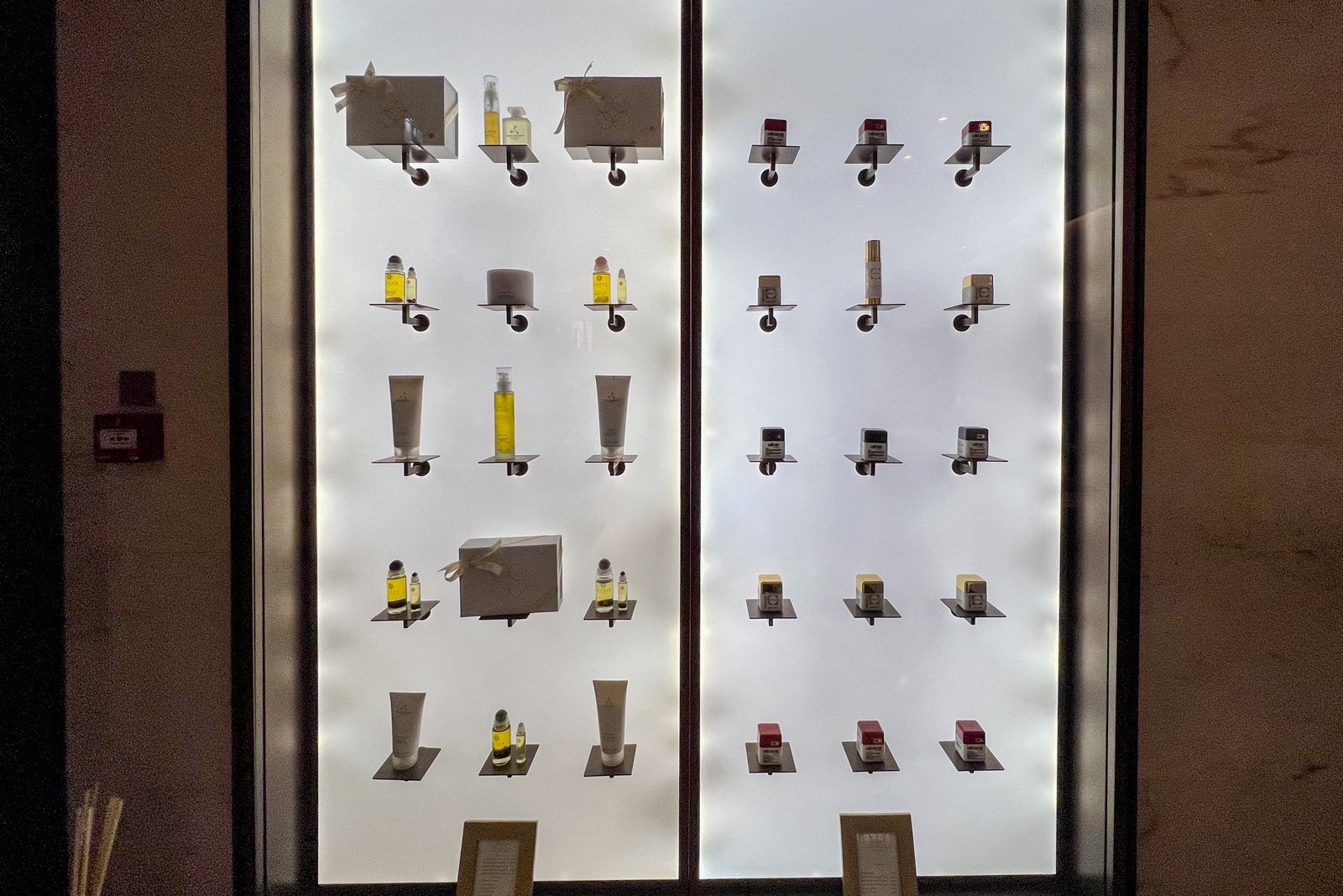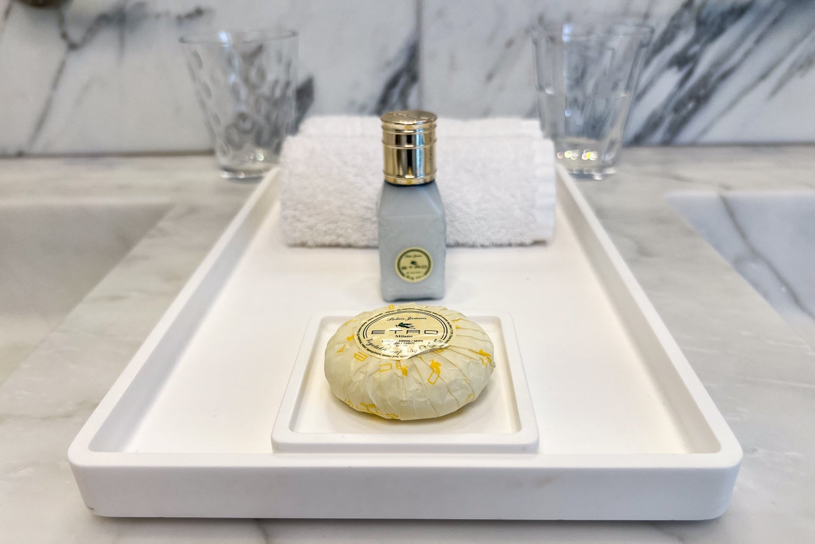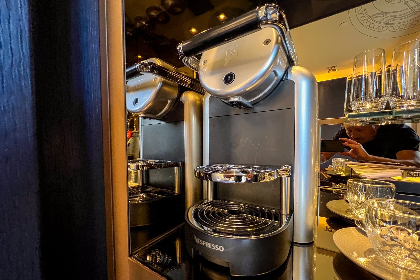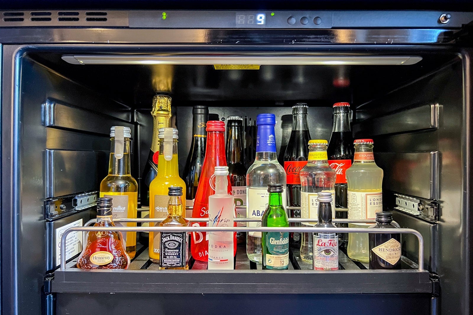 Along the wall next to the swiveling flat-screen Smart TV, the mirrored minibar held a full complement of glassware, including Champagne flutes and wine glasses with which to enjoy the red Bordeaux or white Chablis stocked as well as mugs for coffee from the in-room Nespresso machine. Among the other beverages on offer were various whiskeys and cognacs, Abatilles and Badoit sparkling water, Coca-Cola and Alain Milliat juices. As for treats, there were French specialties Les Cookies de La Mere Poulard apple-caramel biscuits from Normandy, Le Bonbon Français nougat from Provence and various fancy Comptoir du Cacao chocolate bars.