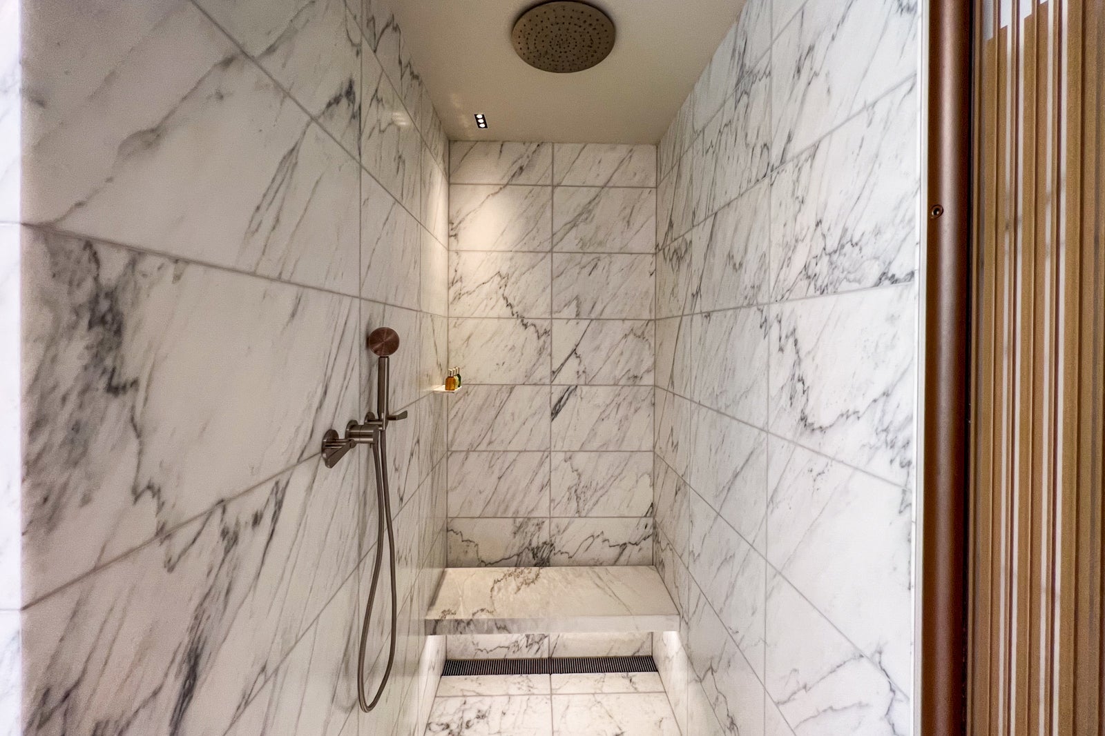 Back toward the entrance, the enormous Carrara marble bathroom seemed like it comprised half the square footage, with French doors and a balcony of its own letting in light, though also a unique circular overhead chandelier for when the blinds were closed for privacy.