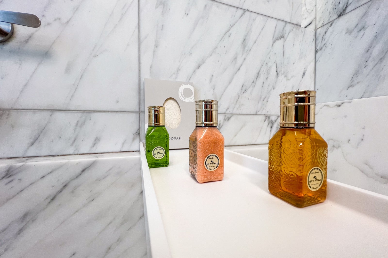 Along the other were a dramatic sleigh-shaped soaking tub and a palatial walk-in shower with a low bench. Woodsy Palais Jamais Etro products were stocked throughout.