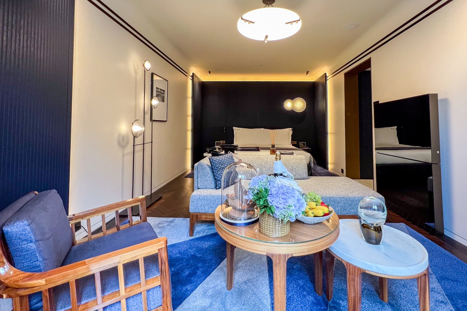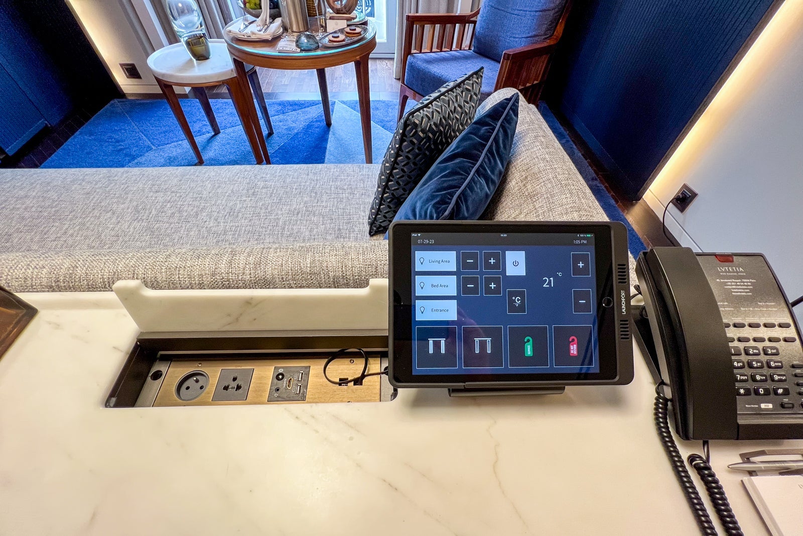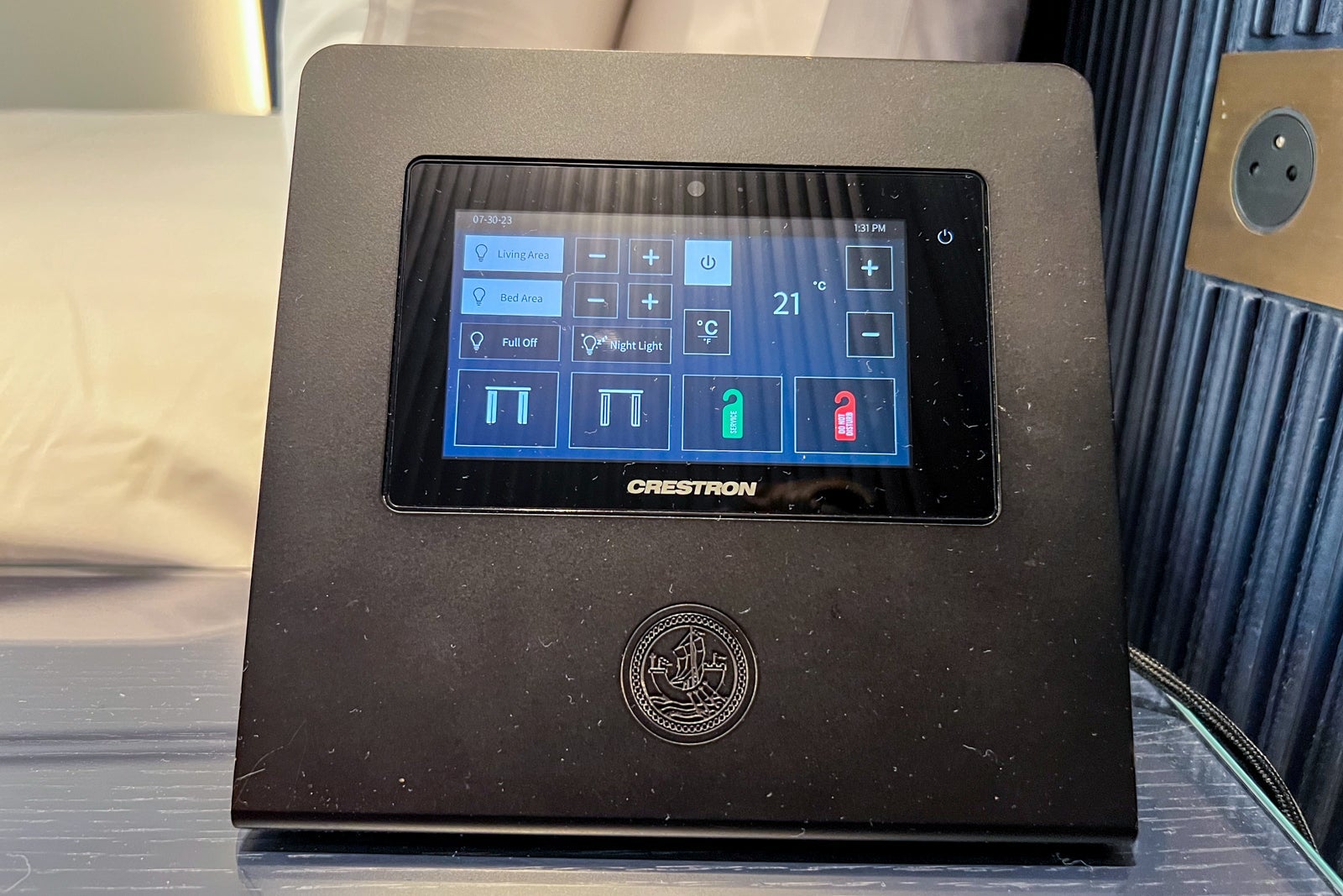 The decor was subtle but sophisticated. Navy-blue wood paneling framing the bed and in one corner created distinct sections to the room without actually partitioning it. The marble-topped desk and leather armchair had a hidden panel for plugs and a tablet to control the lights, temperature and blinds.