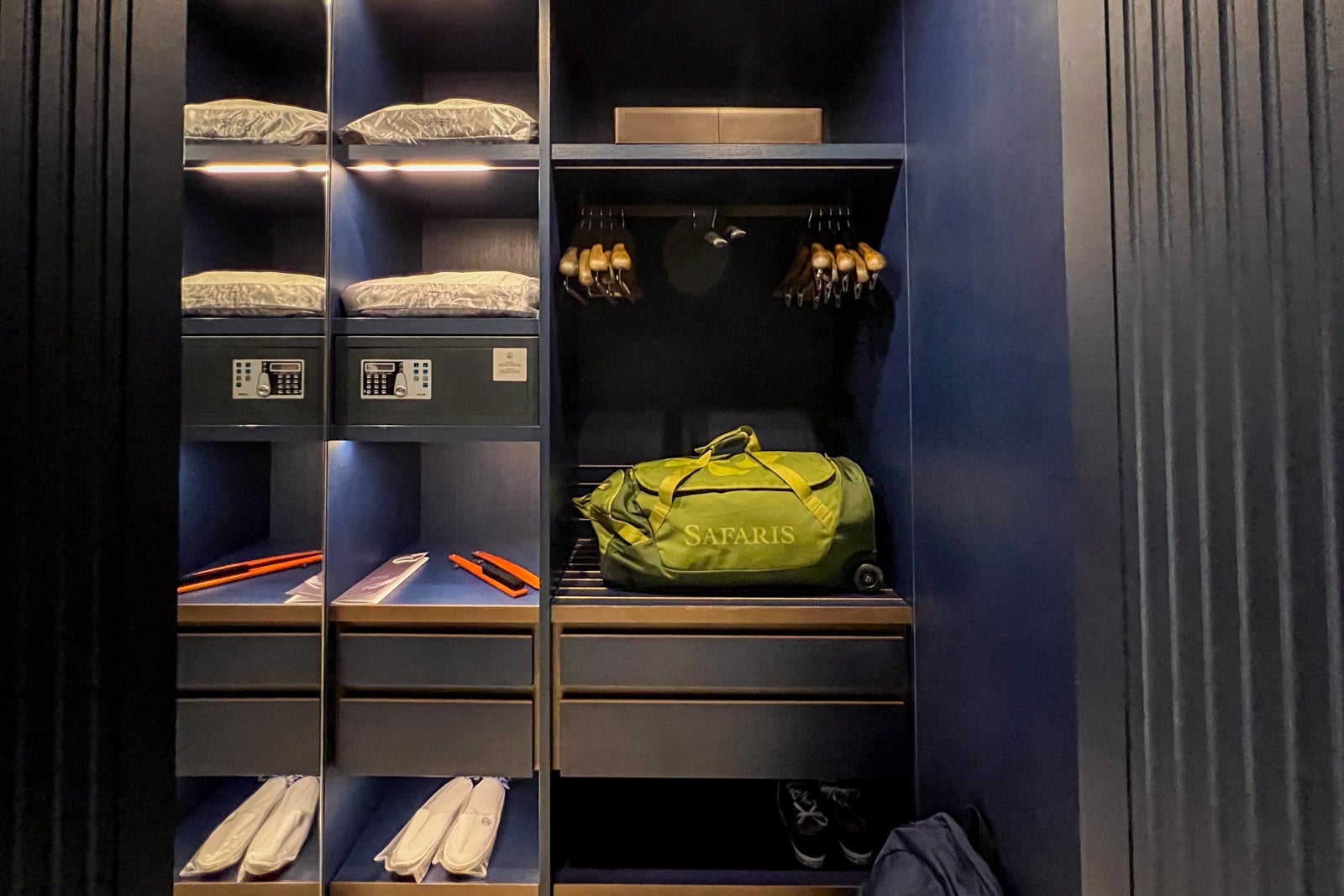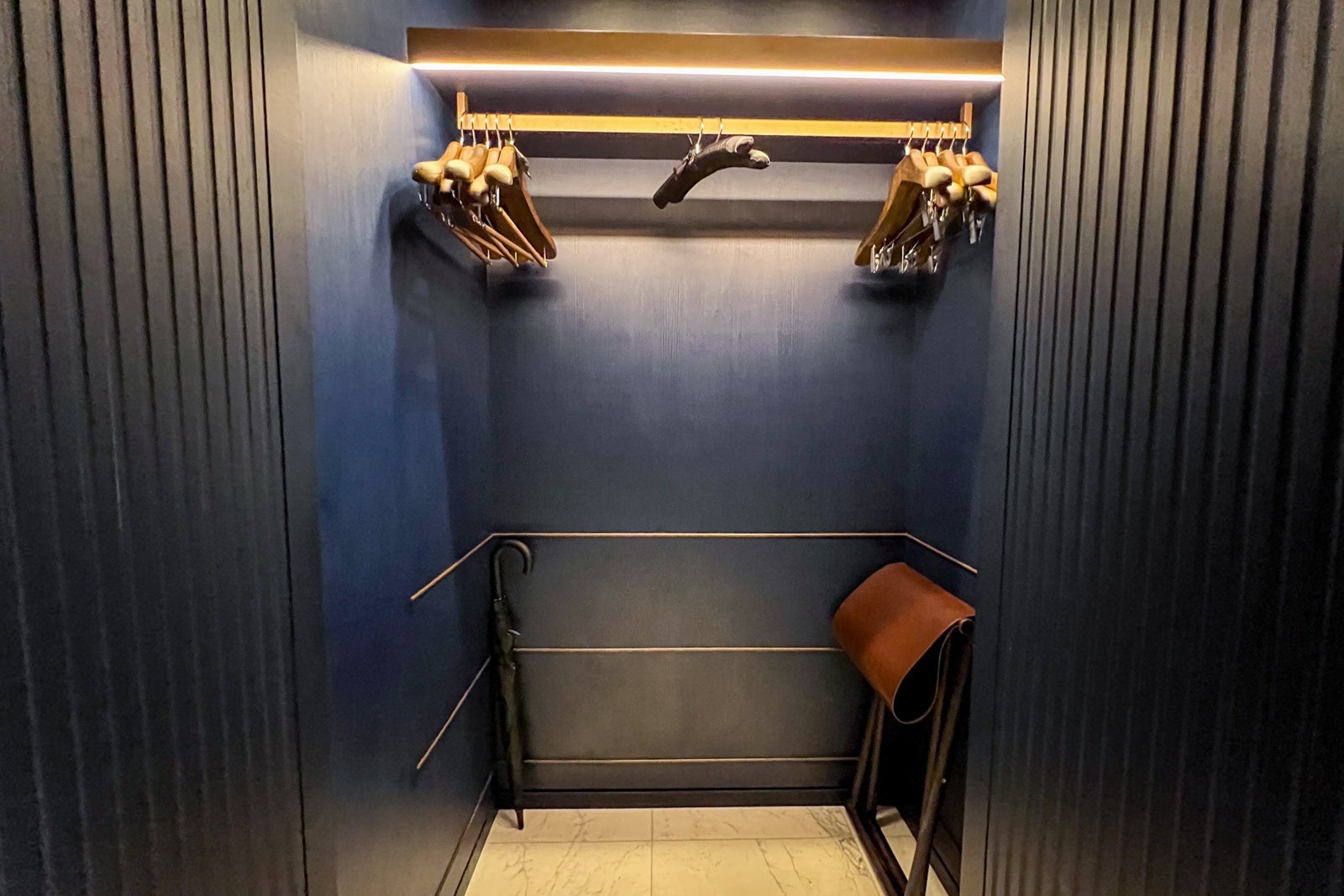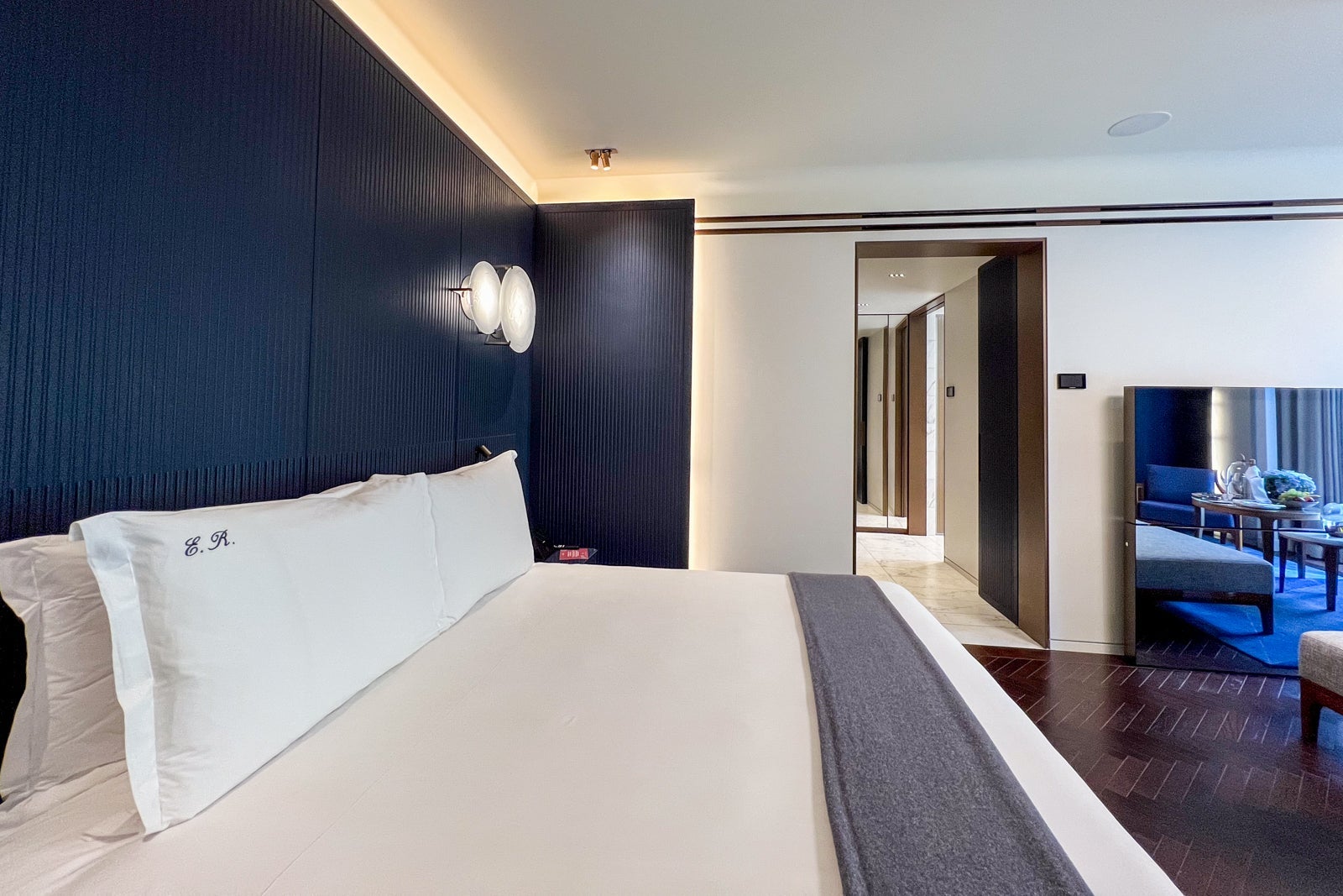 The decor was subtle but sophisticated. Navy-blue wood paneling framing the bed and in one corner created distinct sections to the room without actually partitioning it. The marble-topped desk and leather armchair had a hidden panel for plugs and a tablet to control the lights, temperature and blinds.