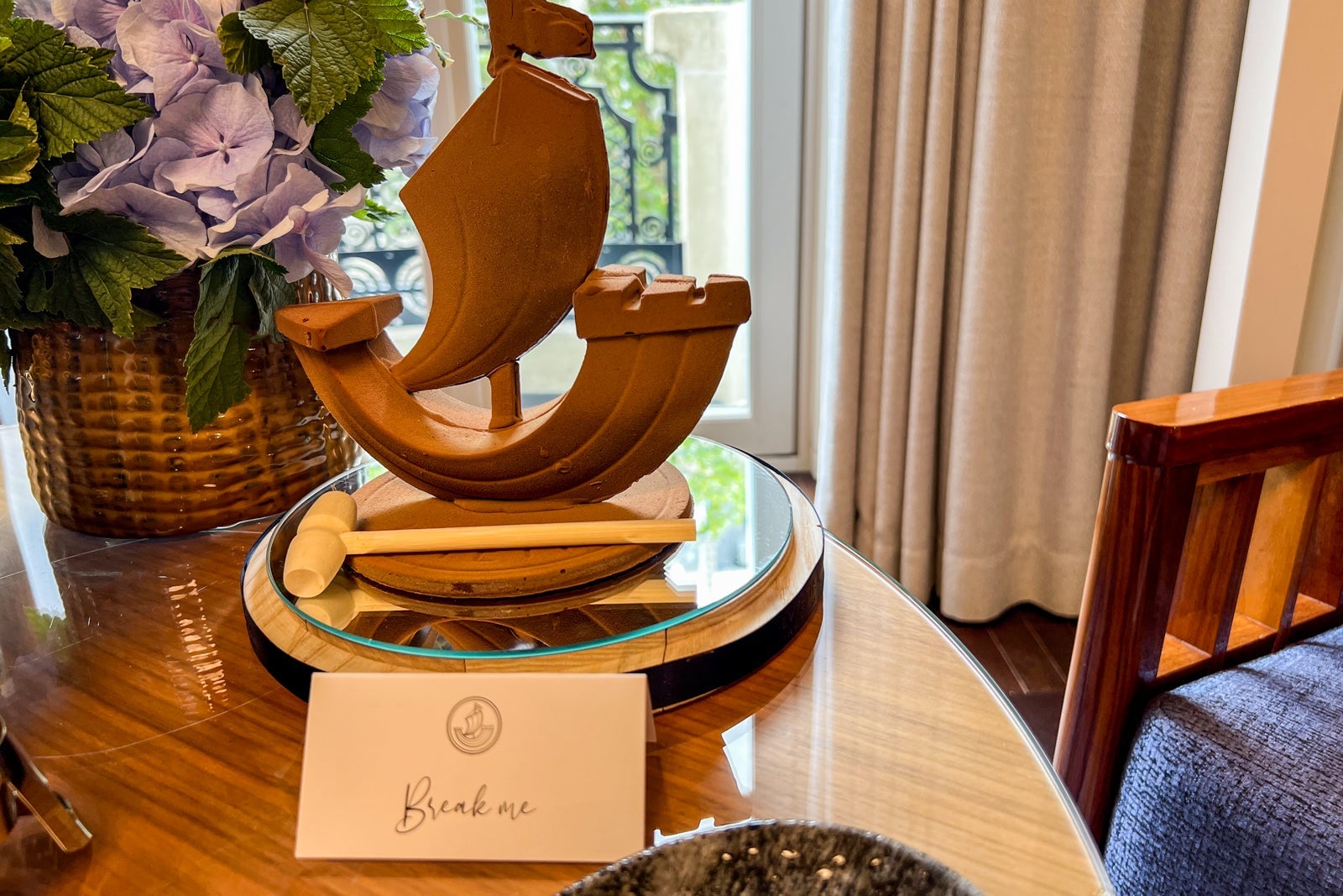 The living room was bright but cozy with a gray-upholstered chaise lounge and a wooden table, which held a welcome amenity of Veuve Clicquot Champagne, fresh fruit, house-made cookies and a chocolate sculpture shaped like a traditional Parisian river ship — the hotel's symbol.